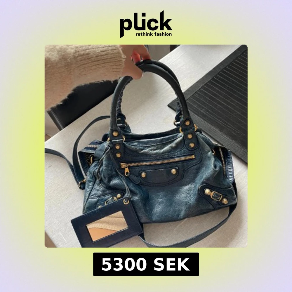 Kollar intresset på min älskade Balenciaga väska i skinn med guldfärgade detaljer och dragkedja. Väskan har en praktisk spegel och flera fack för enkel organisering. Perfekt för att bära med sig det viktigaste med stil. Sista två bilderna visar hur stor den är❤️ köptes här på Plick för 6500kr!