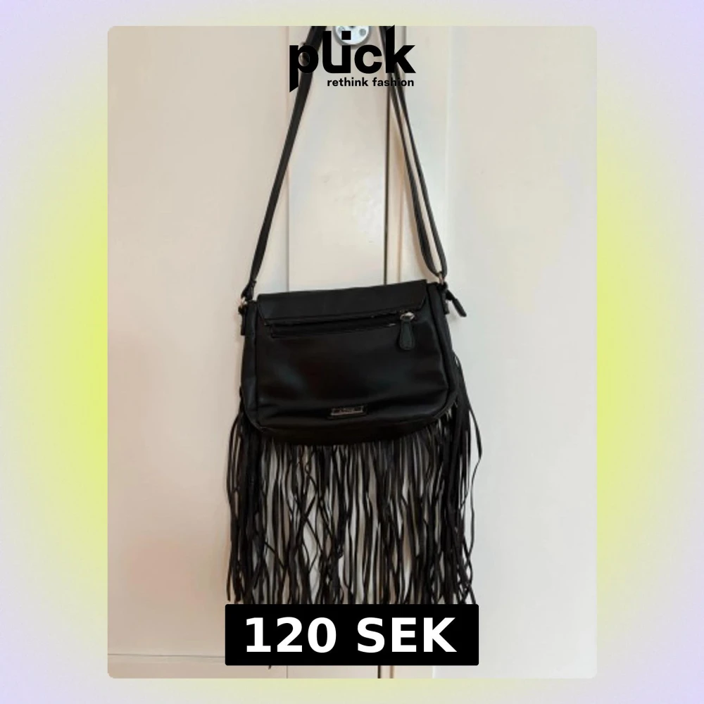 Säljer en svart axelväska från s.Oliver i syntetmaterial. Väskan har långa fransar längs nederkanten, justerbar axelrem och en dragkedjeficka framtill. .