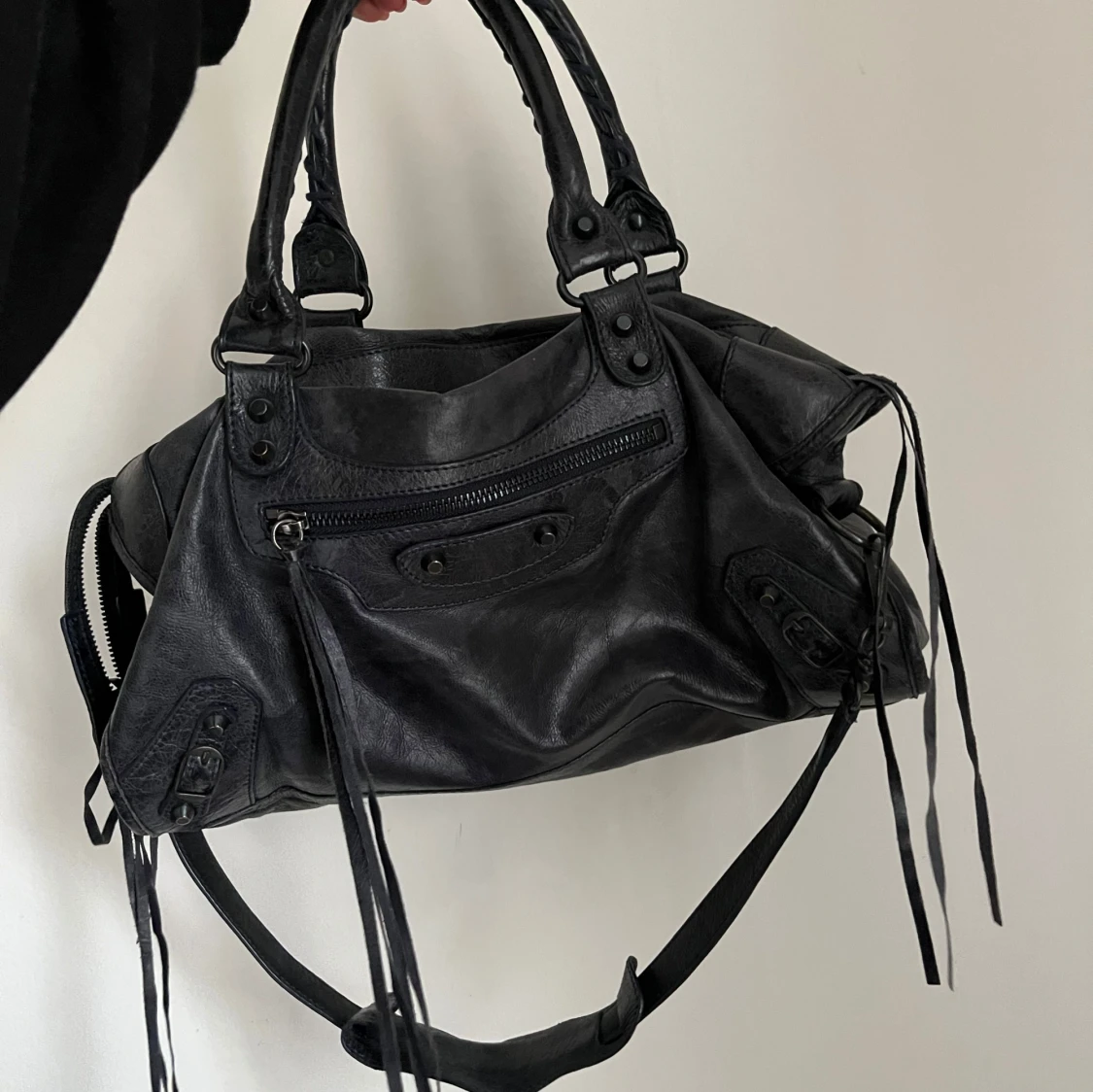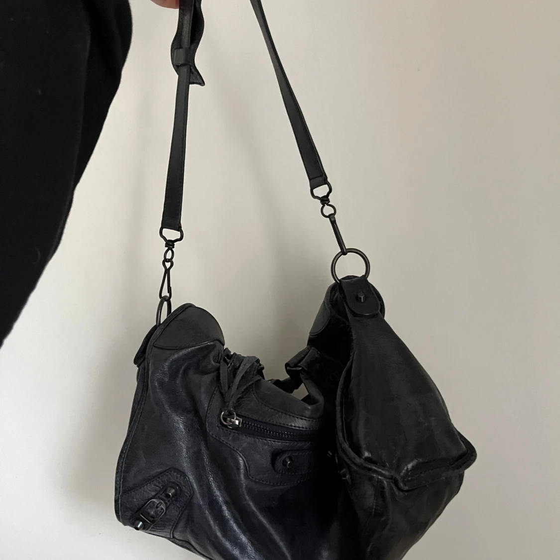 Snygg svart axelväska i skinn med coola detaljer och dragkedja. Väskan har långa remmar och flera fack för praktisk förvaring. Perfekt för att ge din outfit en edgy touch.