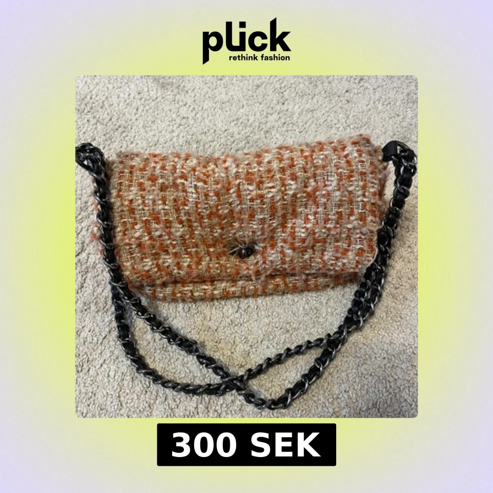 Säljer en snygg axelväska i beige och orange tweed med silverfärgad kedjerem. Väskan har ett rutigt mönster och stängs med ett coolt metallspänne framtill. Lite trasig vid spännet som man kan se på bilden 🧡