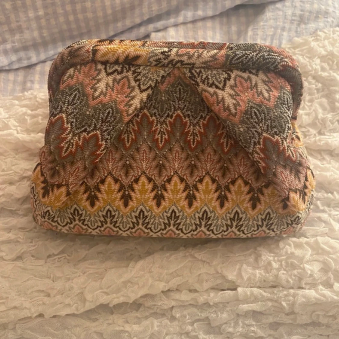 Unik handväska med färgstarkt mönster, väskan har en mjuk form och är tillverkad i ett textilmaterial med snyggt broderad design. Insidan har en dragkedja och logotypetikett. Perfekt för dig som gillar statement-accessoarer. Köpte på vinted