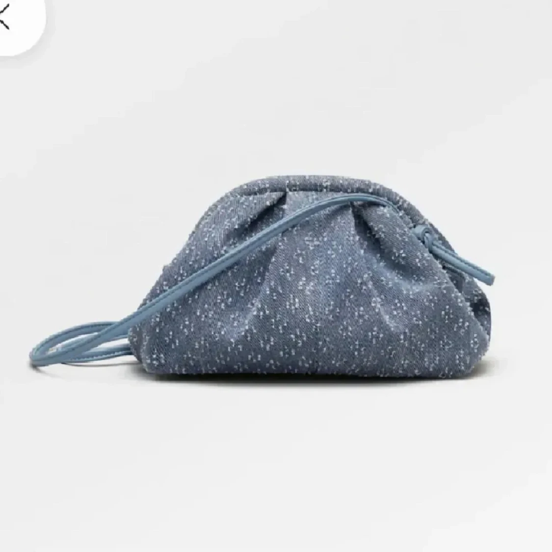 Snygg blå axelväska med ett subtilt prickigt mönster. Väskan har en enkel och stilren design med en praktisk dragsko för att hålla dina saker säkra. Perfekt för att ge din outfit en touch av färg och stil.