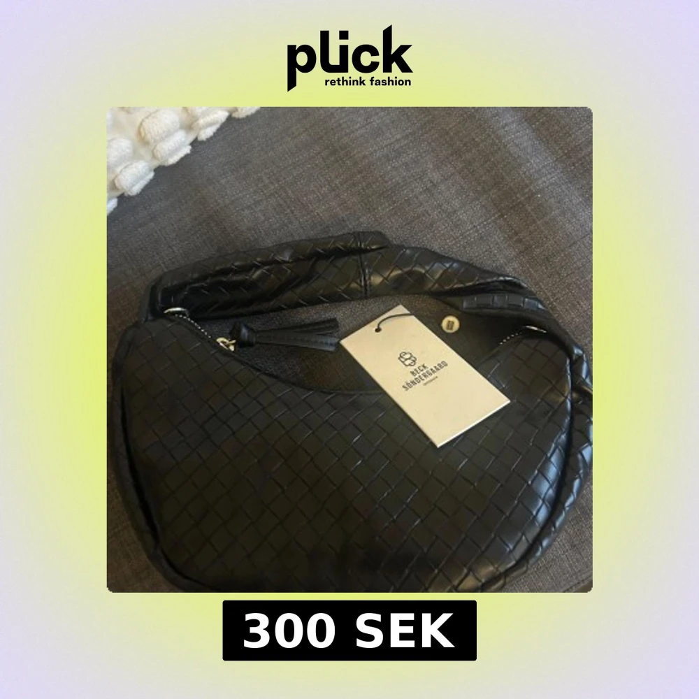Säljer en svart axelväska i flätad design. Väskan har en rundad form, dragkedja och en dekorativ tofs. Perfekt för att lyfta din outfit med en stilren accessoar.