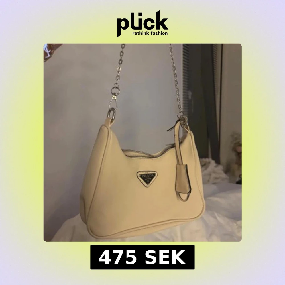 Snygg beige axelväska med klassisk silverfärgad kedja och dragkedja upptill. Väskan har en stilren, mjuk form och ikonisk logga framtill. Insidan är fodrad med svart tyg med diskret mönster och metallbricka med märkning.🫶🏻