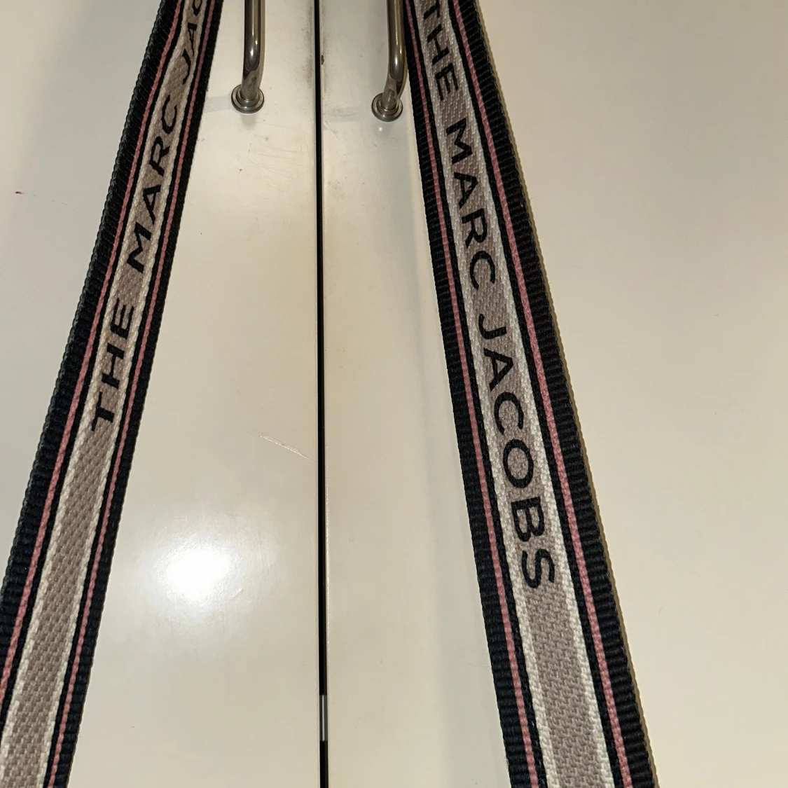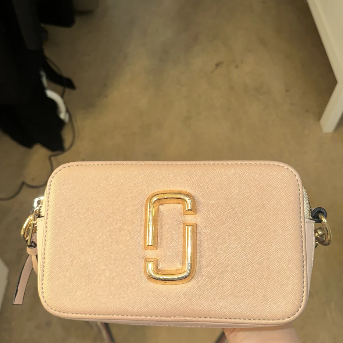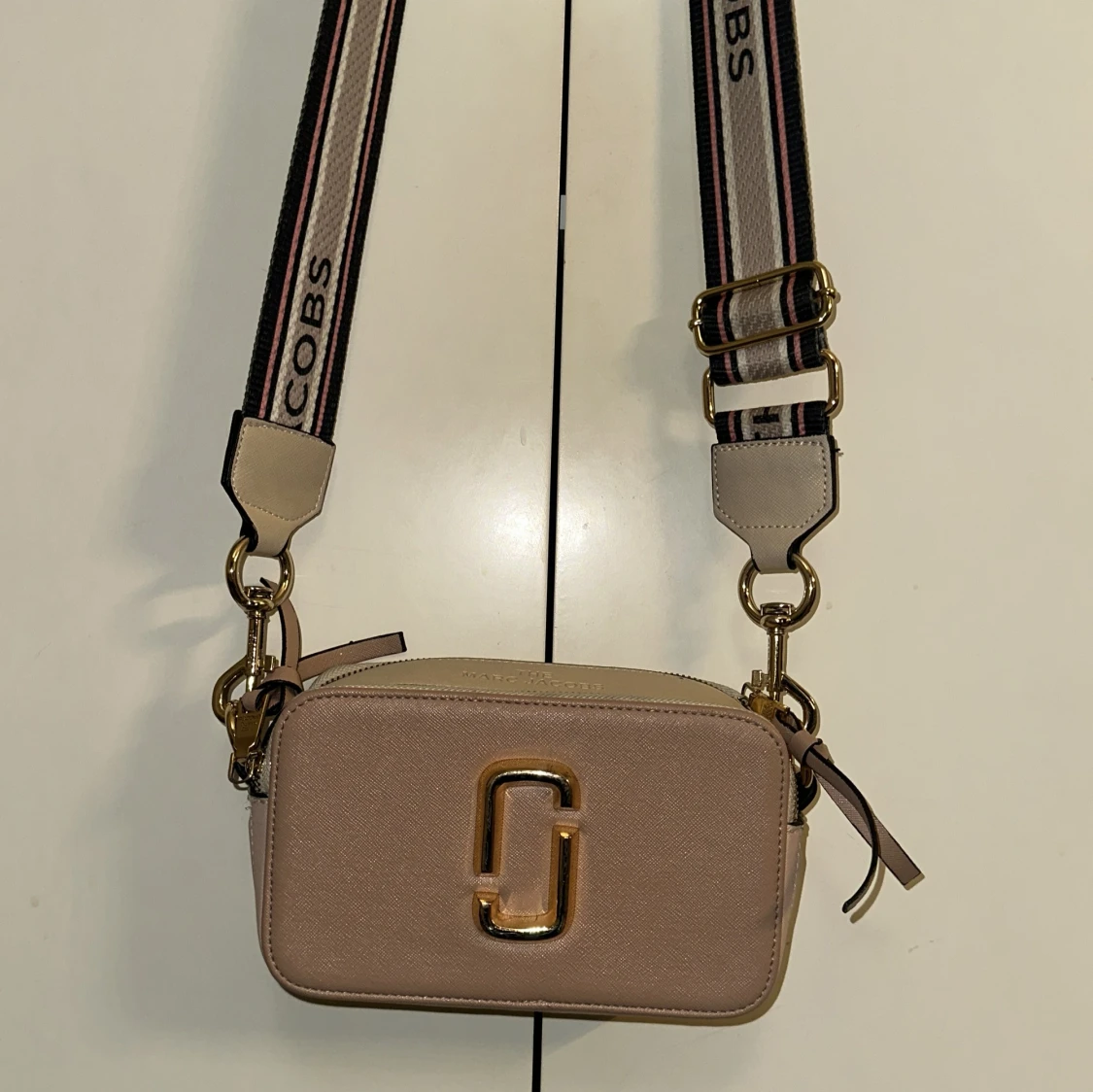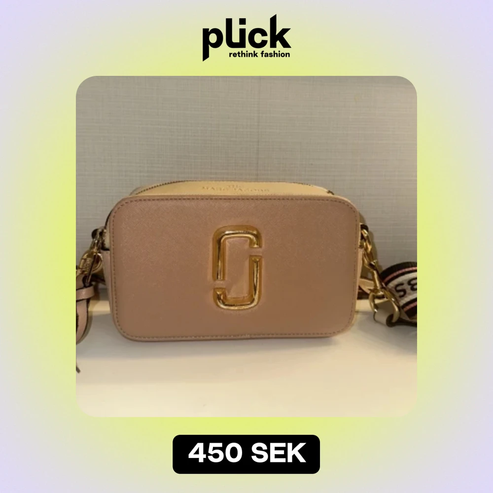 Säljer en superfin rosa axelväska från Marc Jacobs. Väskan har en snygg guldig logga på framsidan och en justerbar axelrem med texten 'THE MARC JACOBS'. Perfekt för både vardag och fest! Köpt för 999 kr och säljer för 450 kr. Ser även real ut.