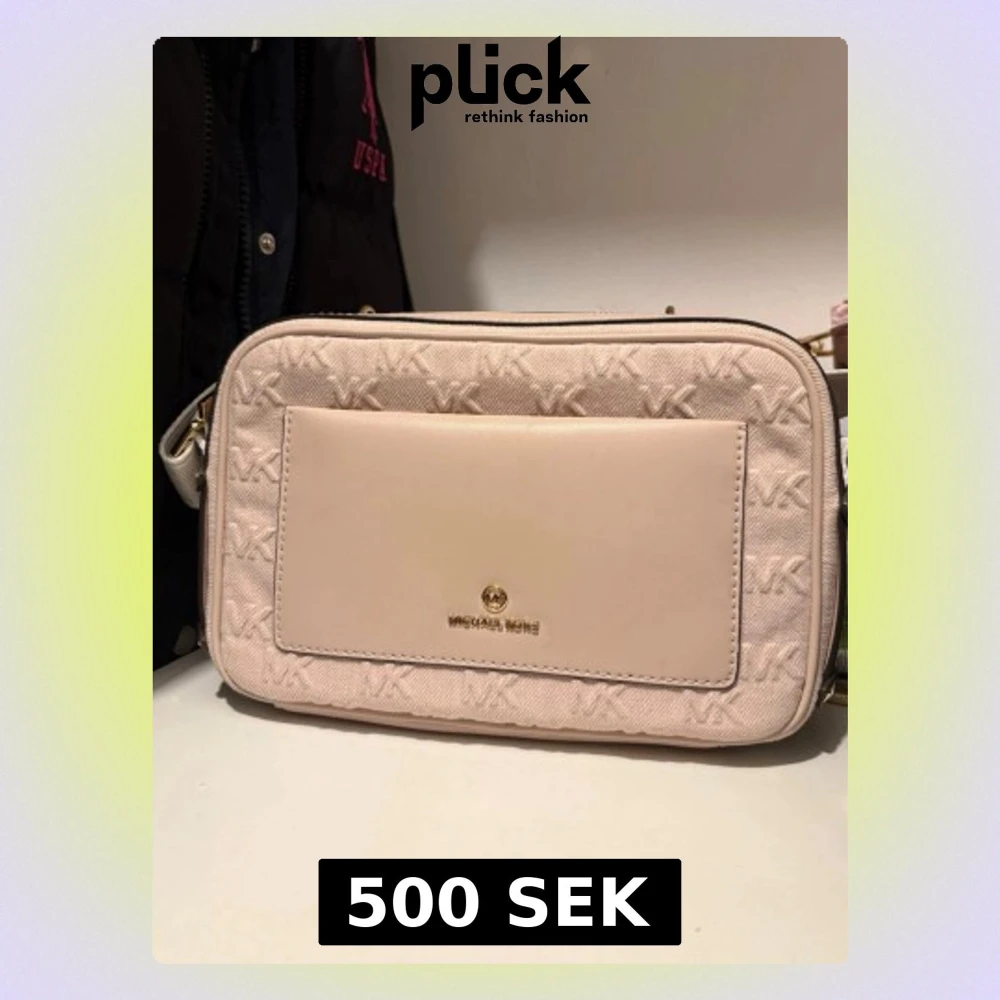 Säljer en snygg beige axelväska från Michael Kors med guldfärgade detaljer och präglat MK-mönster. Väskan har en praktisk ytterficka och dragkedja upptill. Insidan är fodrad med logotypmönster och har en innerficka. Perfekt storlek för det viktigaste!
