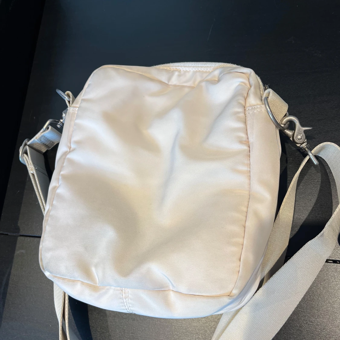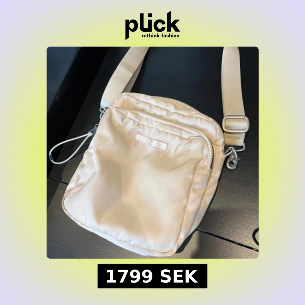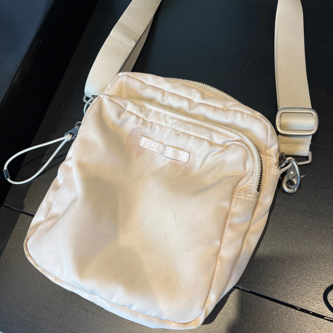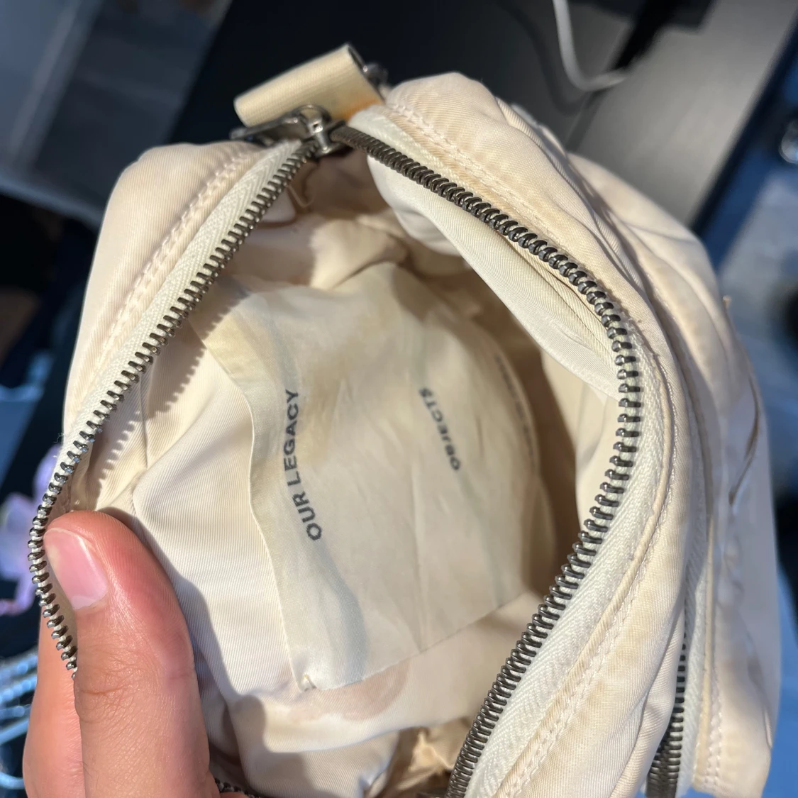 Snygg beige axelväska från Our Legacy med justerbar rem och praktiska dragkedjor. Väskan har en stilren, fyrkantig form och är tillverkad i ett mjukt, glansigt syntetmaterial. Perfekt för dig som vill ha en clean och minimalistisk look.