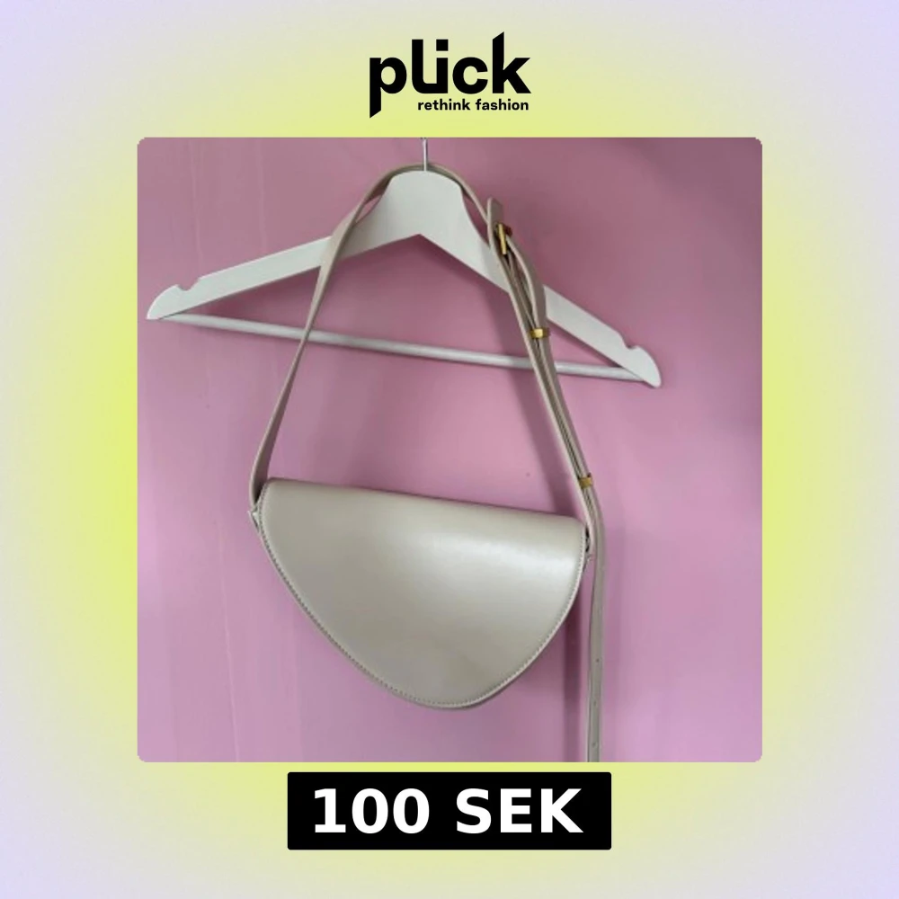 Säljer en stilren beige axelväska med justerbart axelband. Väskan har en halvmåneformad design och är tillverkad i slätt syntetmaterial. Perfekt för att bära det viktigaste och passar till många olika outfits.