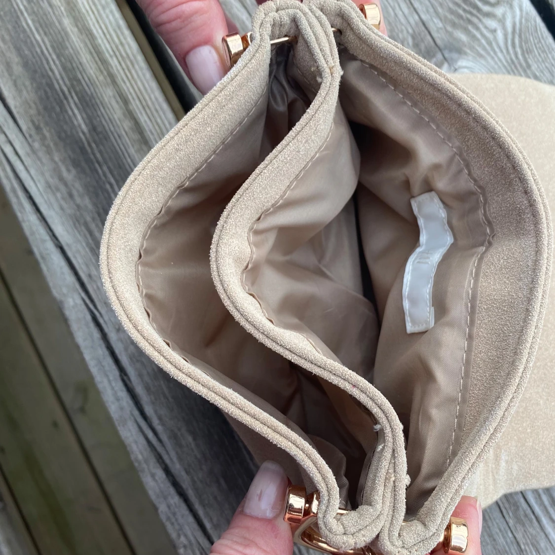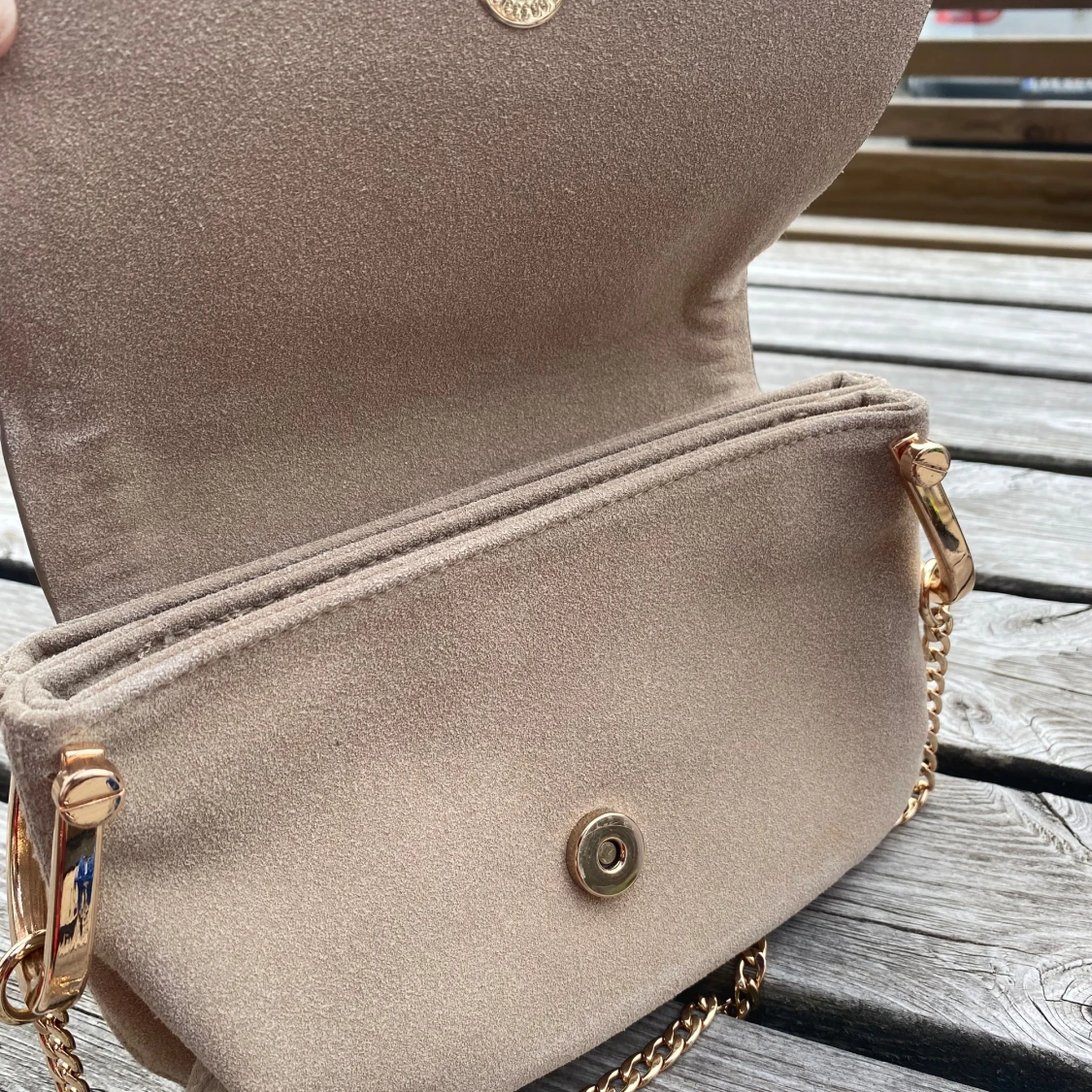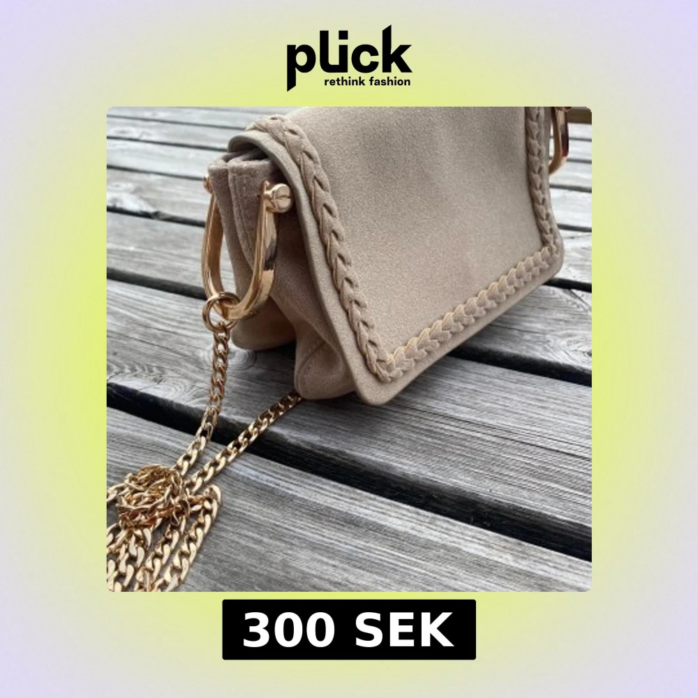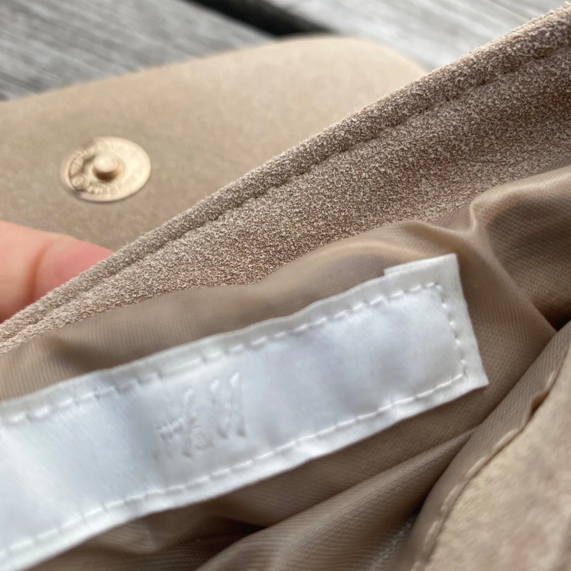 Säljer en beige axelväska från H&M i mjuk mockaliknande material. Väskan har guldfärgade detaljer, kedjerem och dekorativ flätad kant. Perfekt storlek. Den har även två fack inuti.