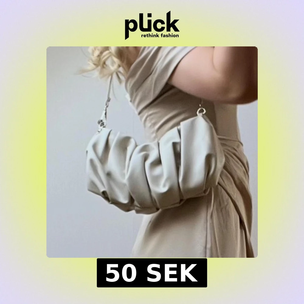 Säljer en superfin beige axelväska med rynkad och puffig design. Väskan har silvriga metalldetaljer och dragkedja upptill. Använd en gång och är i fint skick