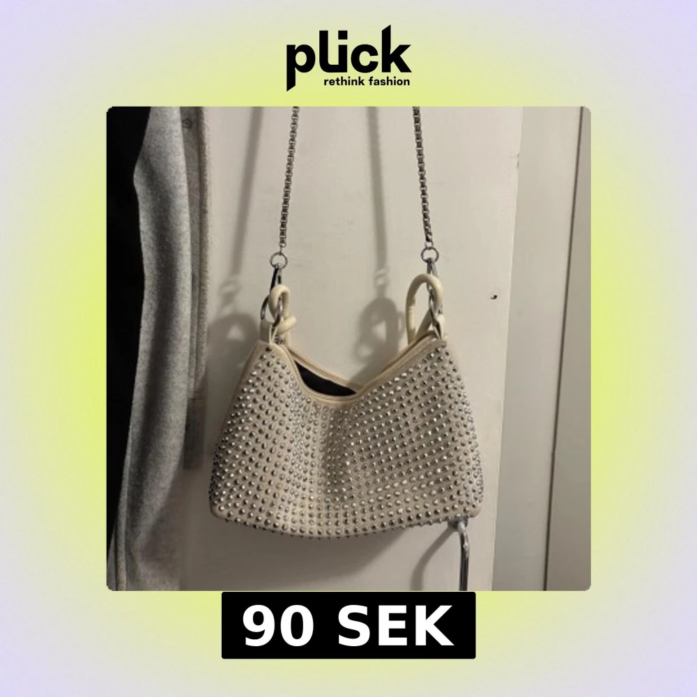 Snygg beige axelväska med massor av glittrande silverpaljetter och en cool kedjerem i metall. Väskan har en mjuk form och detaljer i ljus plast. Perfekt för att lyfta vilken outfit som helst.