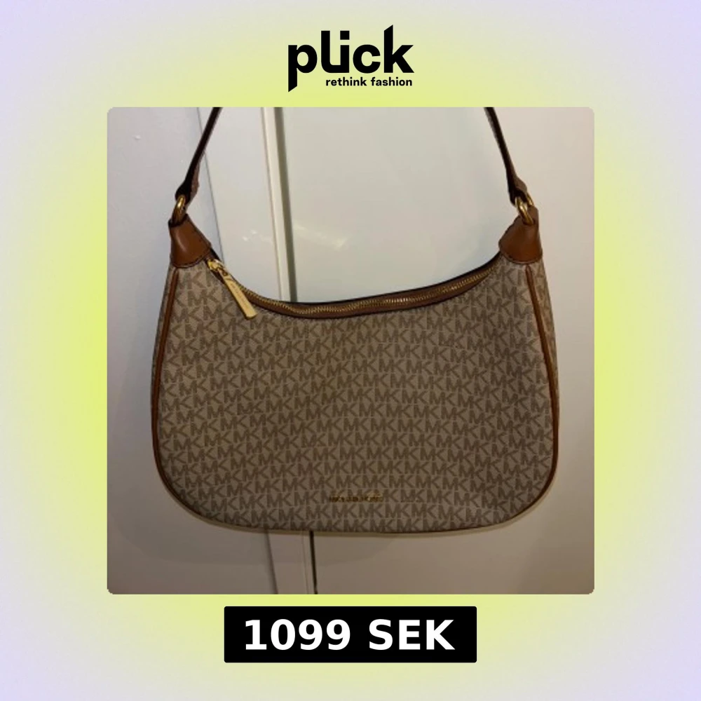Snygg beige axelväska från Michael Kors med klassiskt MK-mönster. Väskan har bruna läderdetaljer och en praktisk dragkedja upptill. Inga skavanker och aldrig använd. Denna väska är perfekt för både vardagsbruk och festliga tillfällen, och lägger till en touch av elegans till vilken outfit som helst. Passa på att förnya din stil med denna tidlösa accessoar! Kontakta mig för mer information eller bilder.