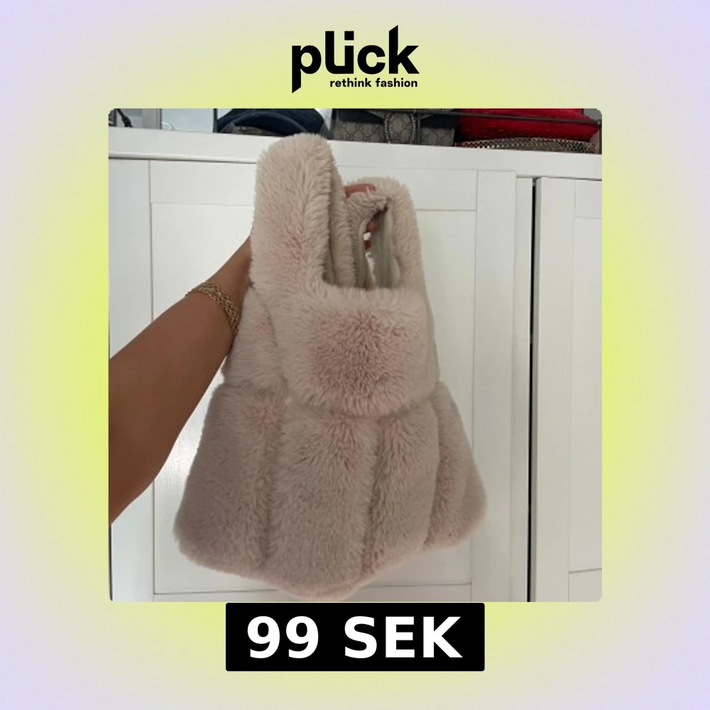 Supermjuk och fluffig axelväska i beige fuskpäls med breda handtag. Väskan har en pösig form och stängs med magnetknapp.