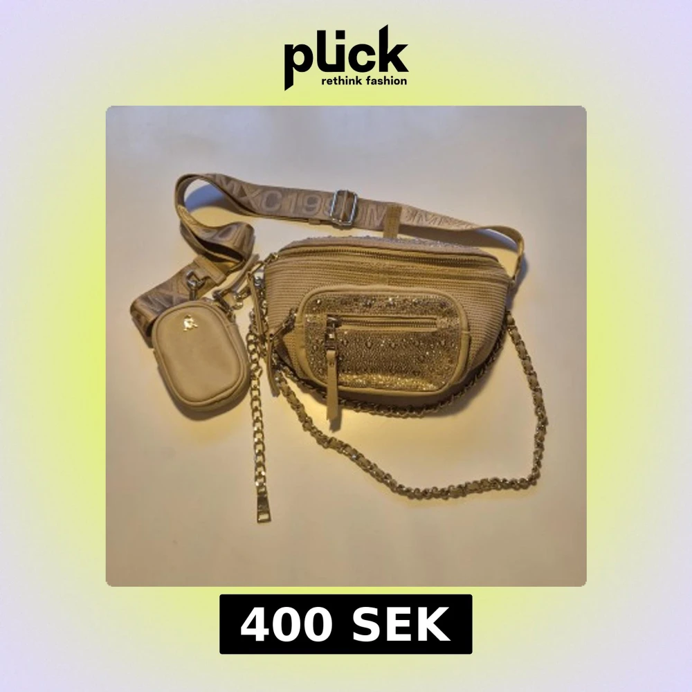 Snygg beige axelväska från Steve Madden med glittriga detaljer och kedja. Väskan har flera fack med dragkedja, justerbar axelrem med logga och en liten matchande miniväska. Perfekt för dig som vill sticka ut med stilrena och glamorösa accessoarer.