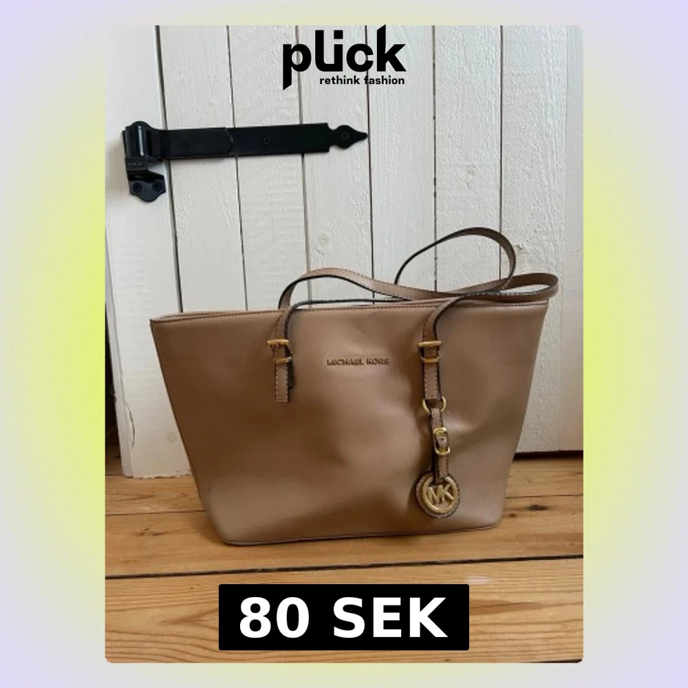 Snygg beige handväska LIKNANDE Michael Kors i skinn med guldfärgade detaljer och klassisk berlock. Väskan har två axelband och enkel, stilren design som passar till det mesta. OBS inte äkta!