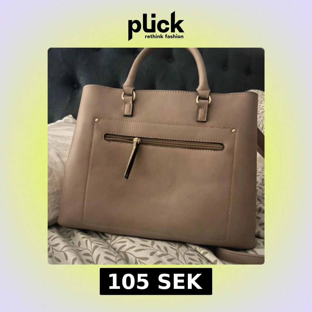 Snygg beige handväska med stilrena guldiga detaljer. Väskan har både handtag och axelrem, samt flera fack och dragkedjor för smart förvaring. Perfekt för dig som vill ha en klassisk och rymlig väska med stilren look.