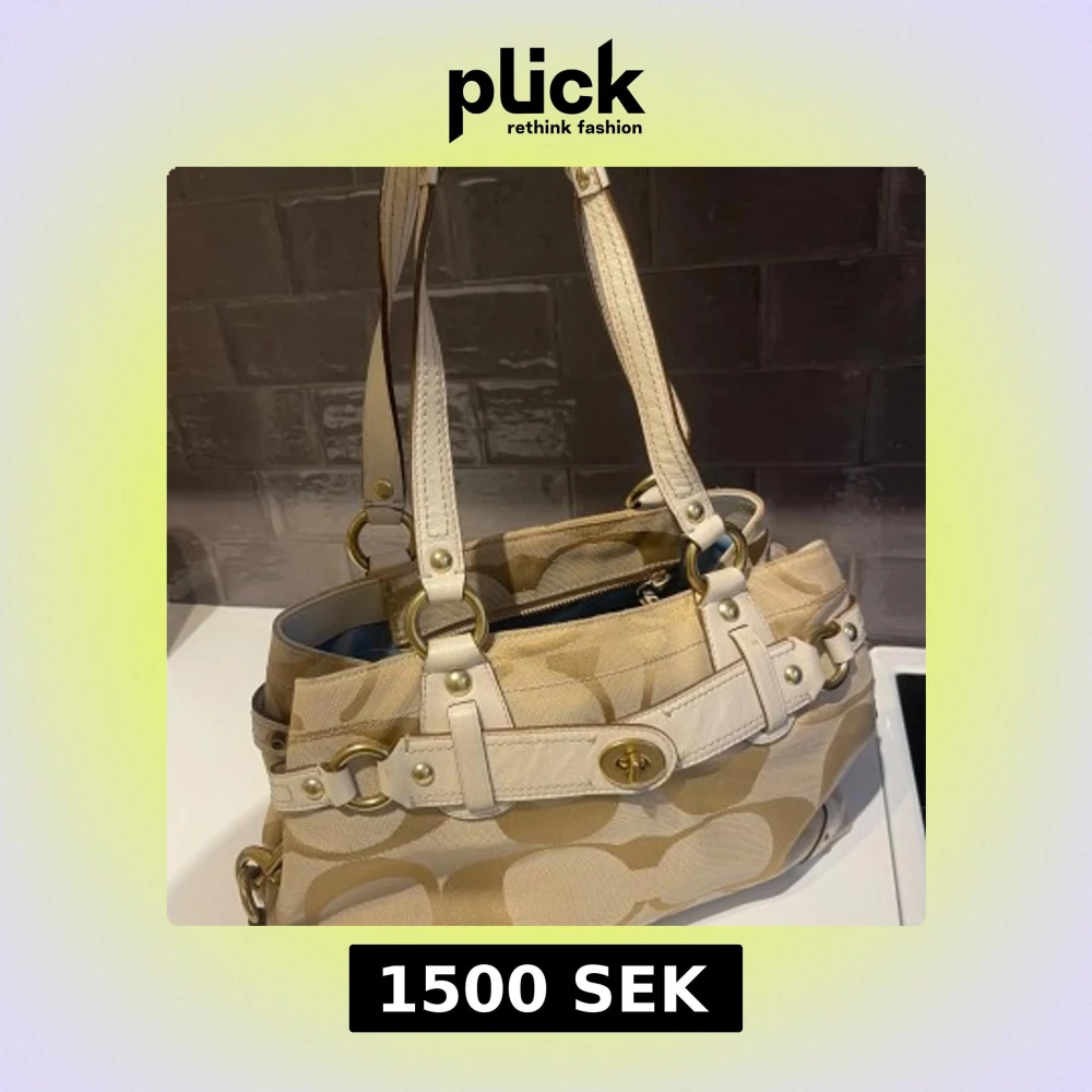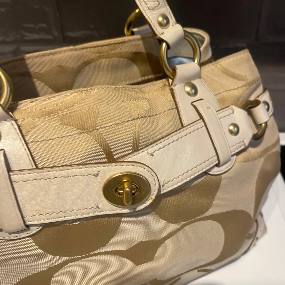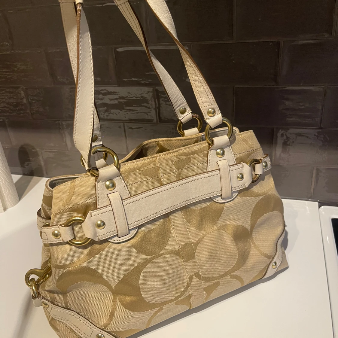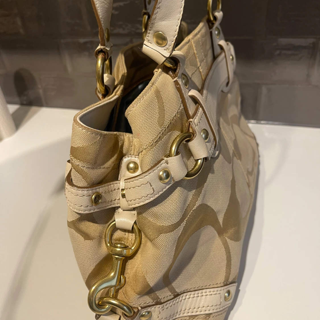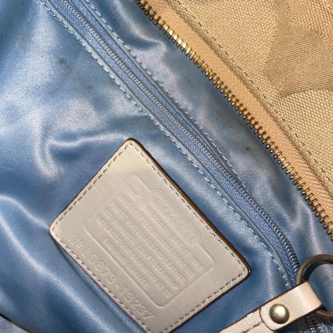Snygg beige handväska från Coach. Väskan har guldfärgade metalldelar och dubbla handtag. Insidan är fodrad med ljusblått tyg och har en innerficka med dragkedja. Väskan är äkta, köpt i Japan för 6 månader sedan. Har några fläckar på insidan men i fint skick annars!