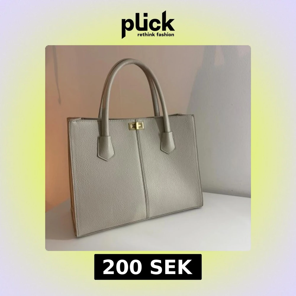 Stilren beige handväska från Gina Tricot i strukturerat syntetmaterial. Väskan har två rejäla handtag, avtagbar axelrem och guldfärgade metalldetaljer. Rymmer allt du behöver och har ett klassiskt, fyrkantigt snitt med svart innerfoder och dragkedjefack. Endast använd en gång, inga defekter alls💞