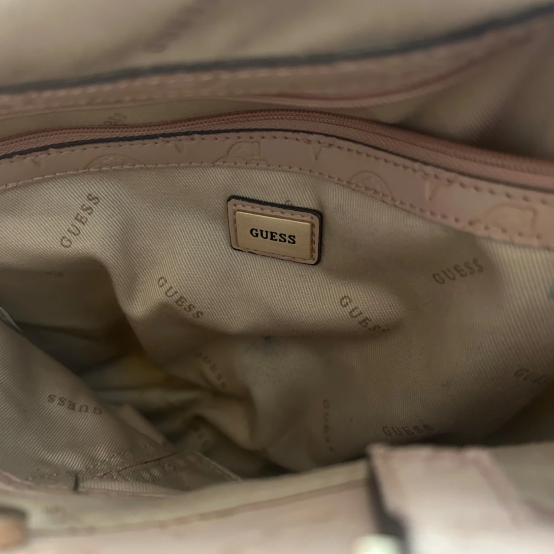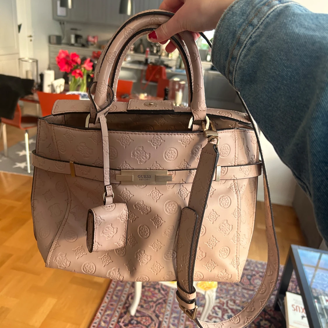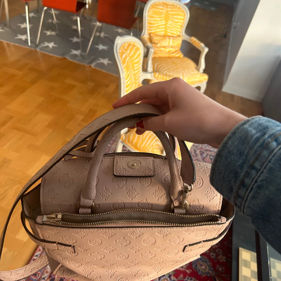 Snygg beige handväska från Guess med präglat mönster och praktisk dragkedja. Väskan har både handtag och en avtagbar axelrem för flexibilitet. Perfekt för att bära dina dagliga nödvändigheter med stil.