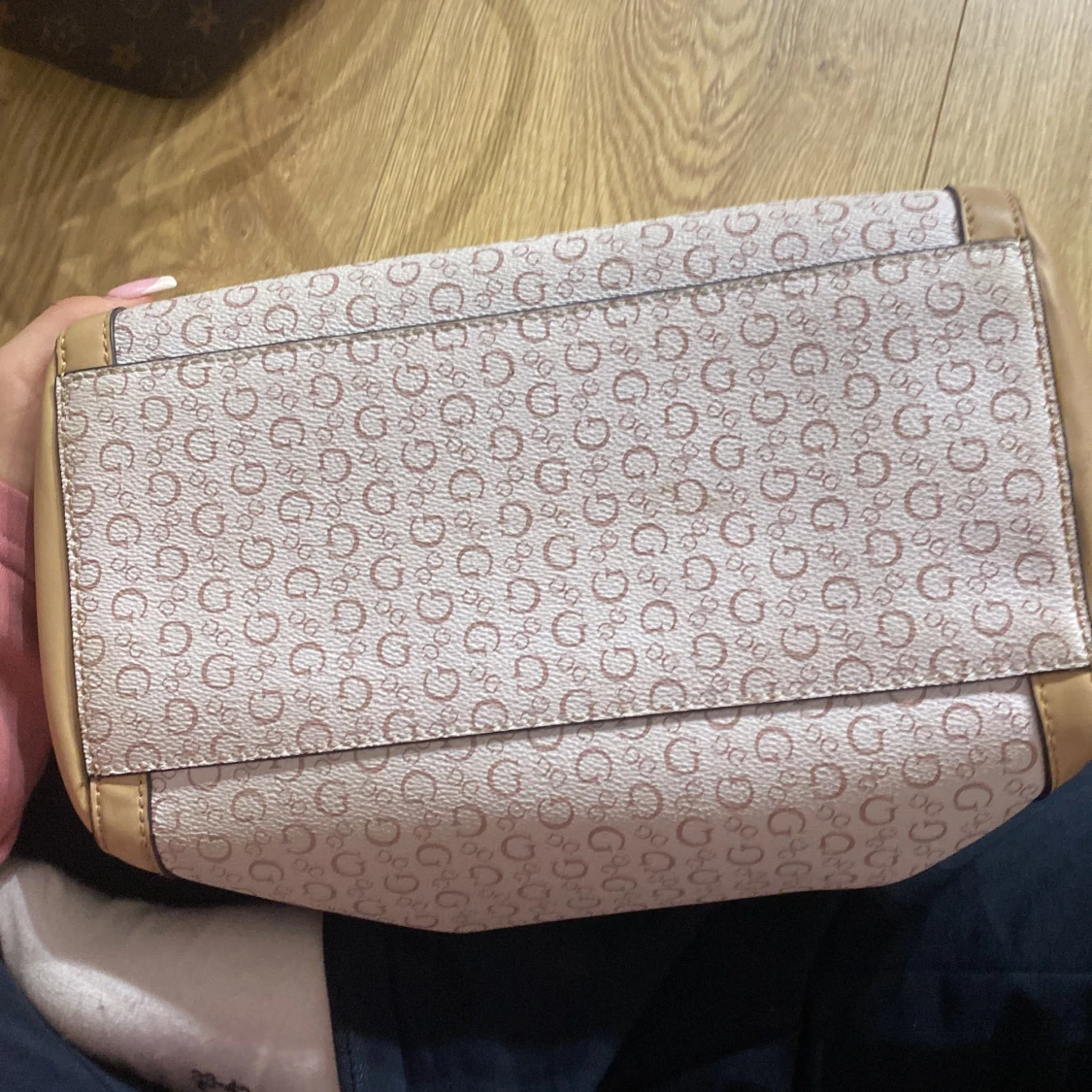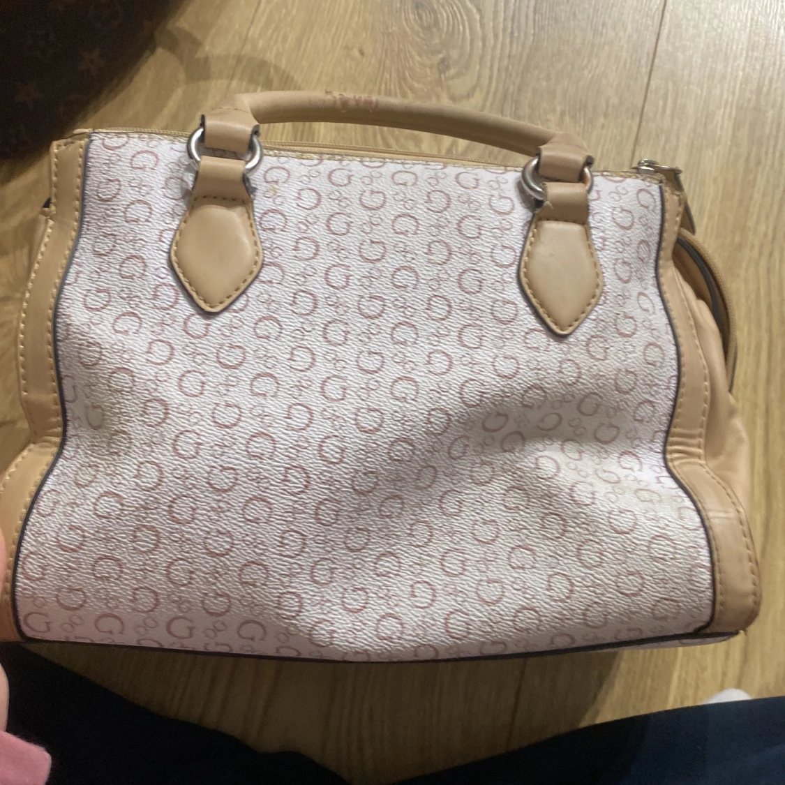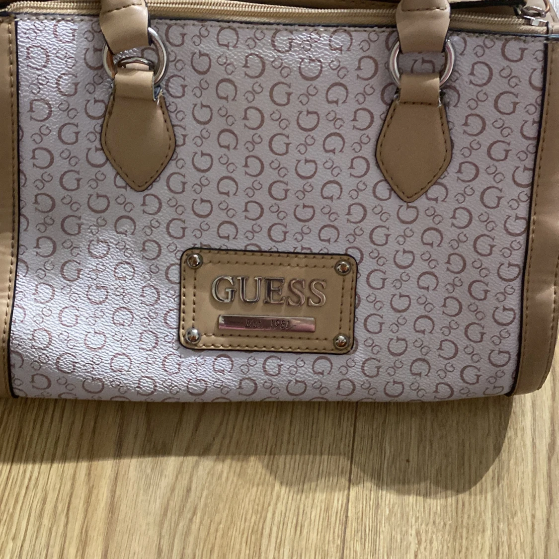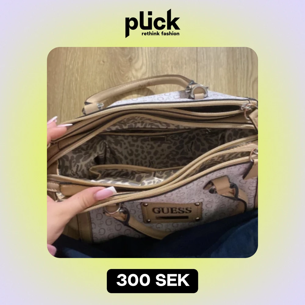 Säljer en snygg beige handväska från Guess. Väskan har ett mönster med små G-logotyper och detaljer i ljusbrunt skinn. Den har flera fack inuti och en dragkedja för att hålla dina saker säkra. Perfekt för både vardag och fest!