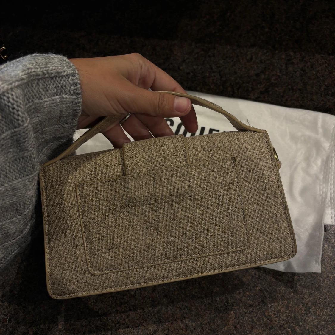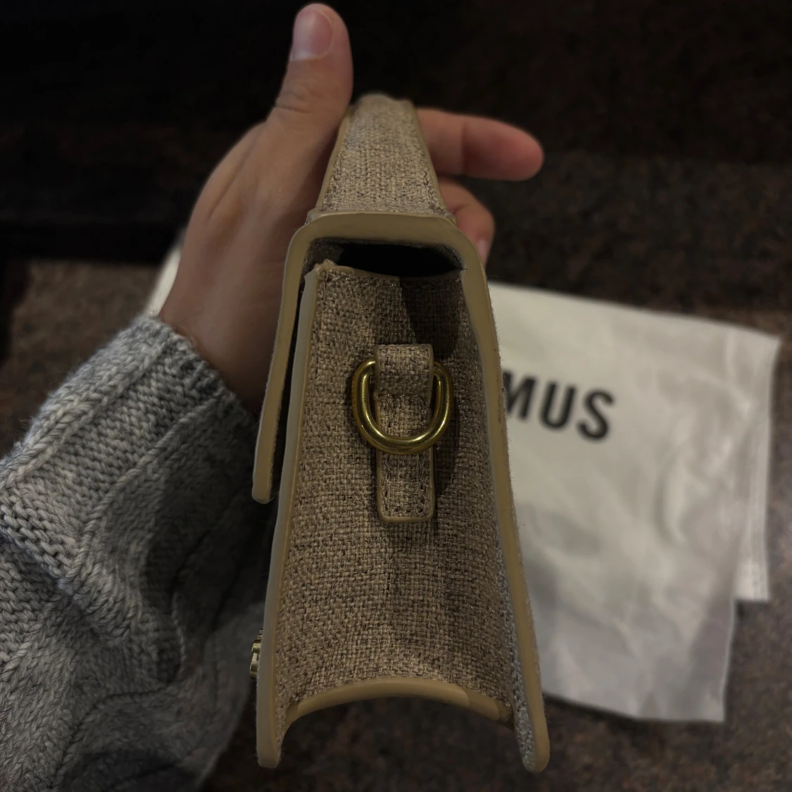Snygg beige handväska från Jacquemus med stilren, rektangulär form och guldfärgad logga. Väskan är tillverkad i linne med detaljer i skinn och har ett praktiskt handtag samt guldfärgade metalldetaljer på sidan. Dustbag och matchande axelrem ingår. Ej äkta.