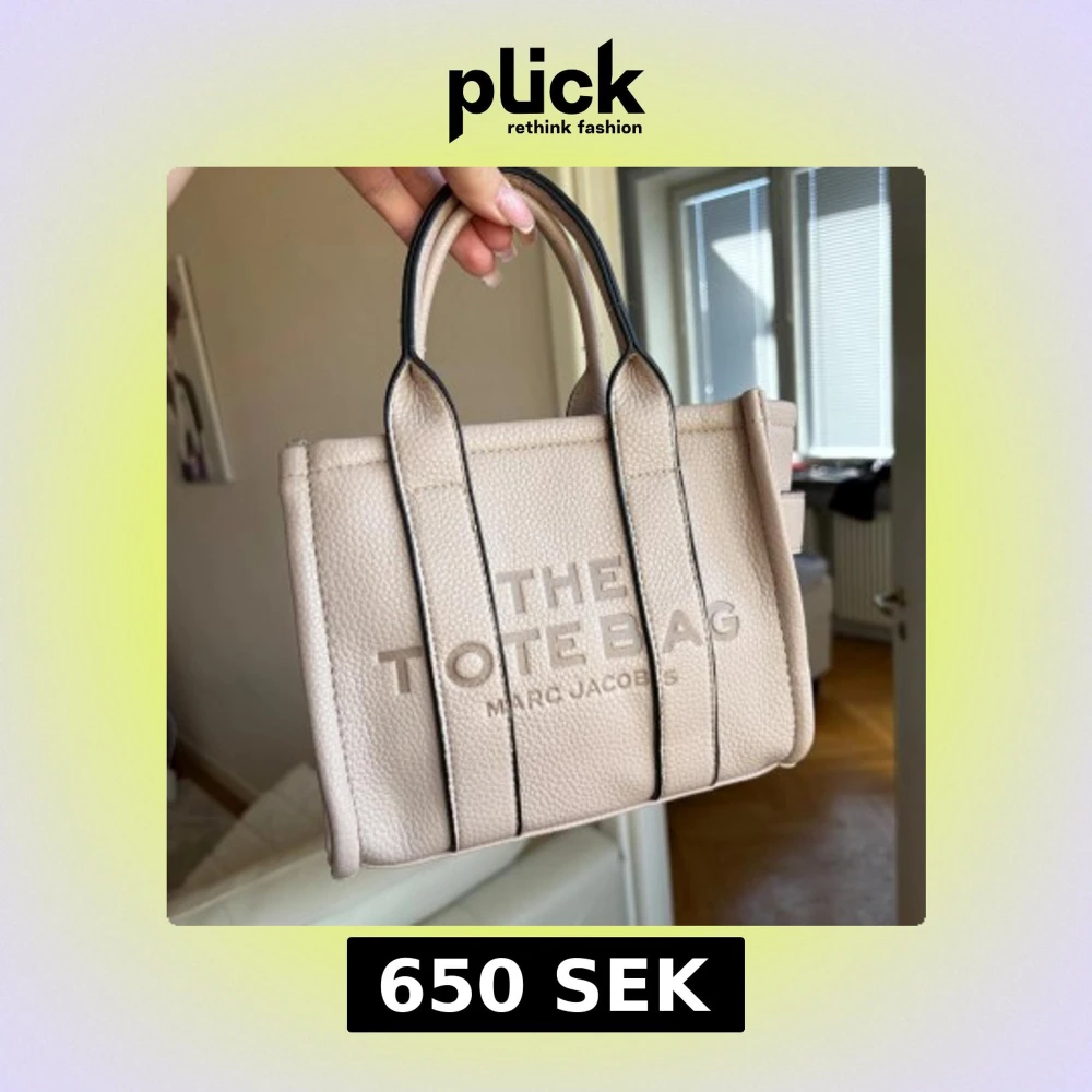 Säljer en beige handväska från Marc Jacobs med texten 'THE TOTE BAG' på framsidan. Väskan har två handtag och är tillverkad i ett strukturerat syntetmaterial. Perfekt för att bära det viktigaste i vardagen.