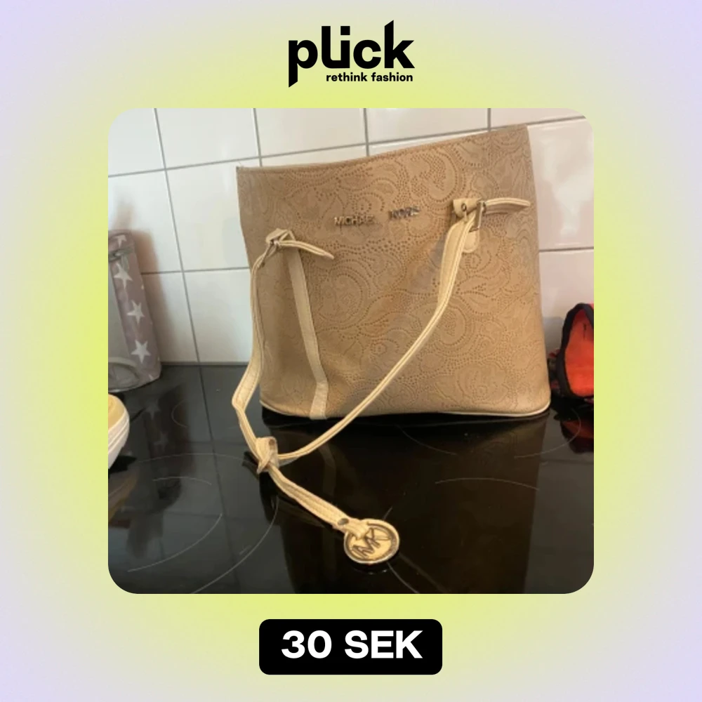Säljer en snygg beige handväska från Michael Kors. Väskan har ett elegant mönster och är i syntetmaterial. Den har praktiska dragkedjor inuti för säker förvaring. Perfekt för både vardag och fest! Är fläckig inuti.
