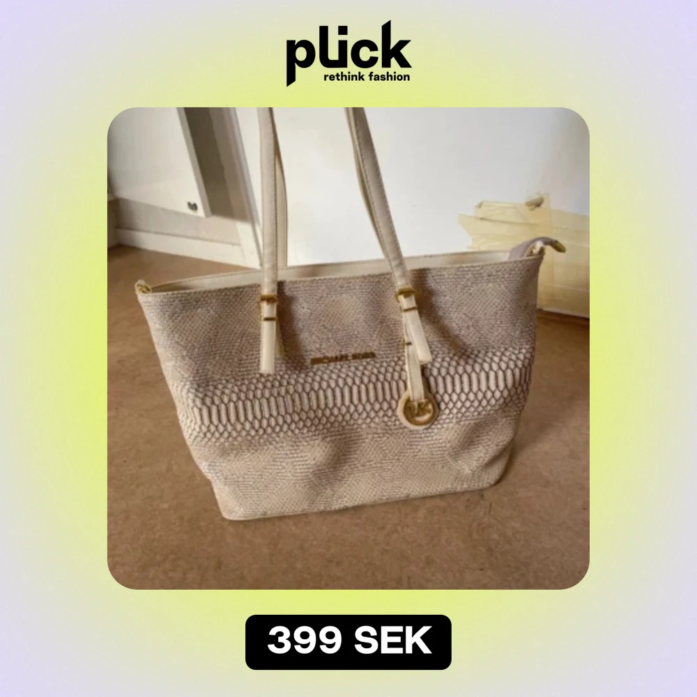 En elegant beige handväska från Michael Kors med ett ormskinnsmönster. Väskan har två långa handtag och en avtagbar axelrem. Den har en dragkedja och flera innerfickor för förvaring. kan ej garantera äktheten!