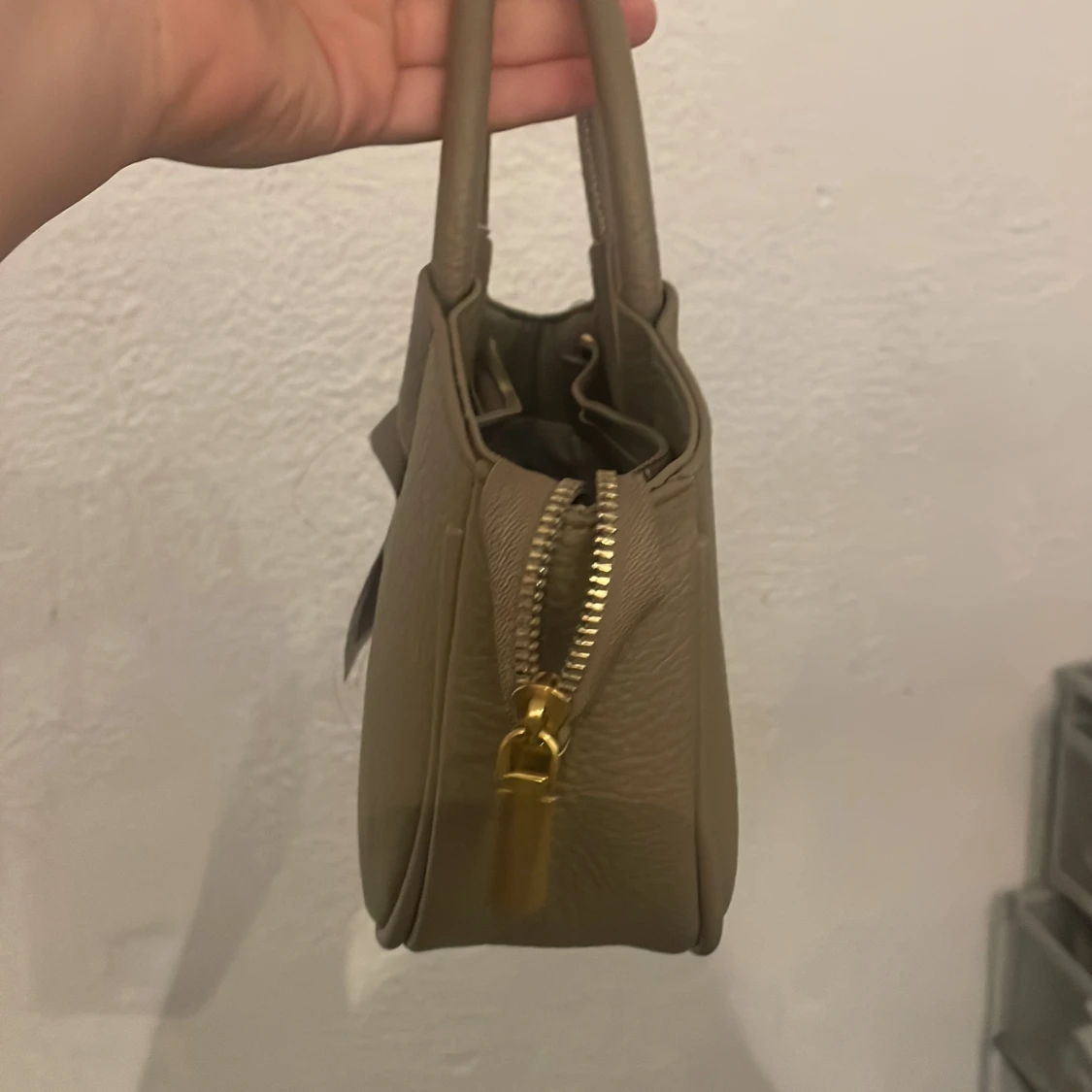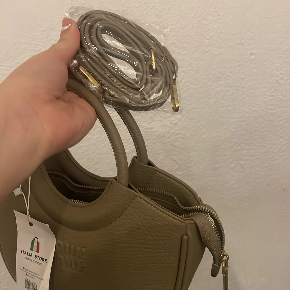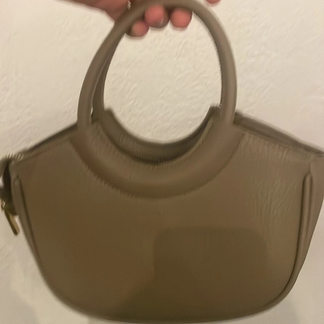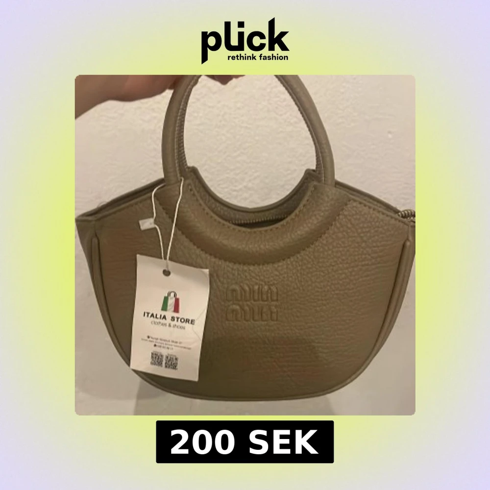 Snygg beige handväska från Miu Miu i mjukt skinn med rundade handtag och guldfärgad dragkedja. Väskan har en stilren, halvmåneformad design och kommer med en matchande axelrem. Perfekt för dig som gillar minimalistisk och trendig look.