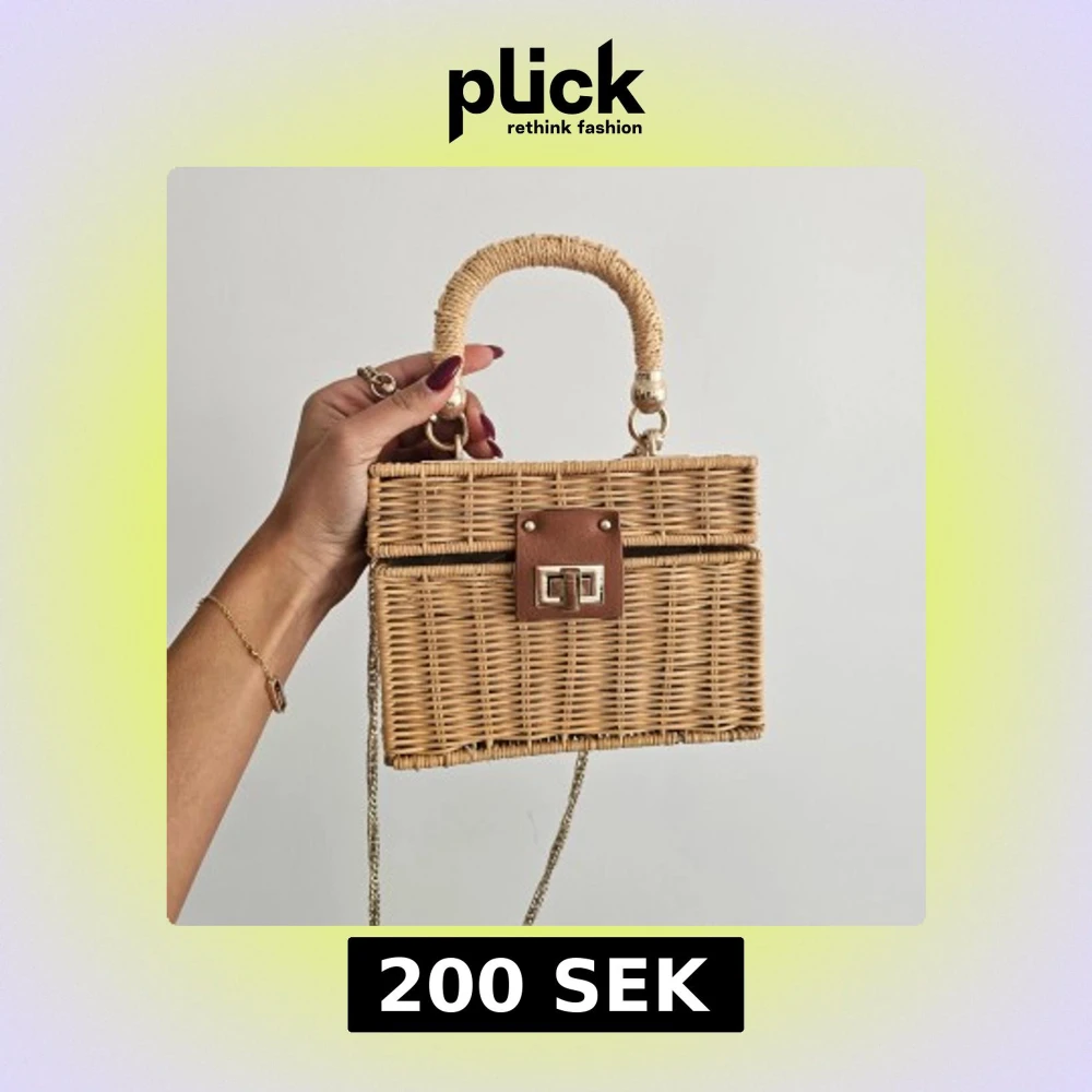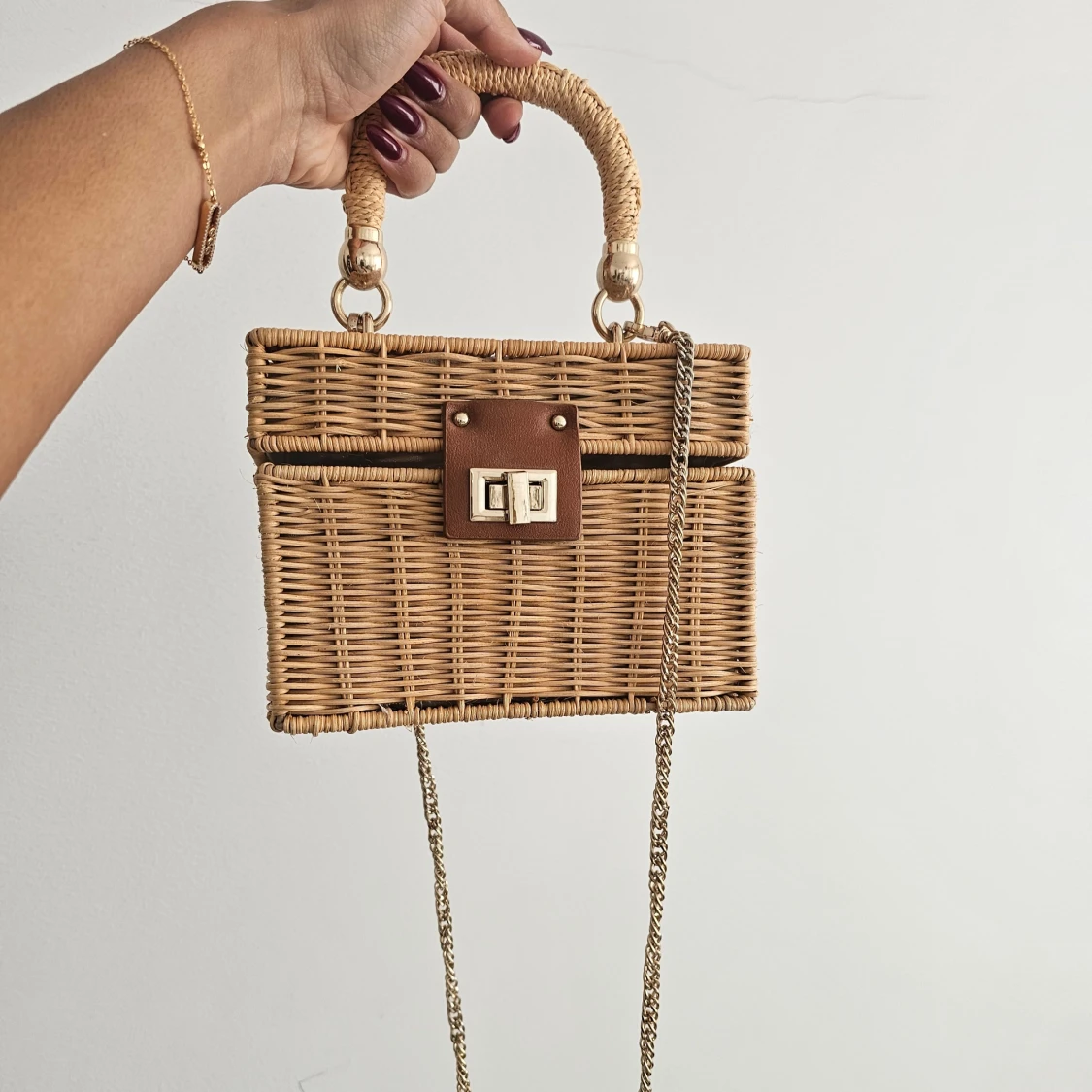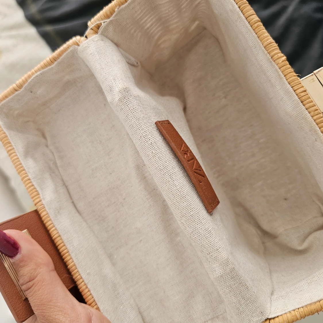 Superfin handväska i beige rotting från Zara med fyrkantig form, brunt skinnspänne och guldfärgade detaljer. Handtaget är lindat och väskan har en kedjerem för axeln. Insidan är fodrad i ljus bomull. Perfekt accessoar för en trendig look.