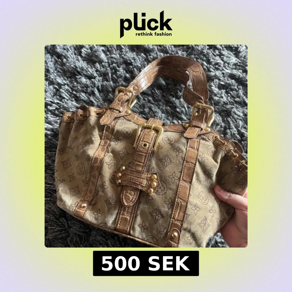 Snygg beige handväska med monogram och bruna detaljer. Väskan har guldfärgade spännen och nitar som ger en lyxig känsla. Perfekt för att bära dina dagliga nödvändigheter med stil.