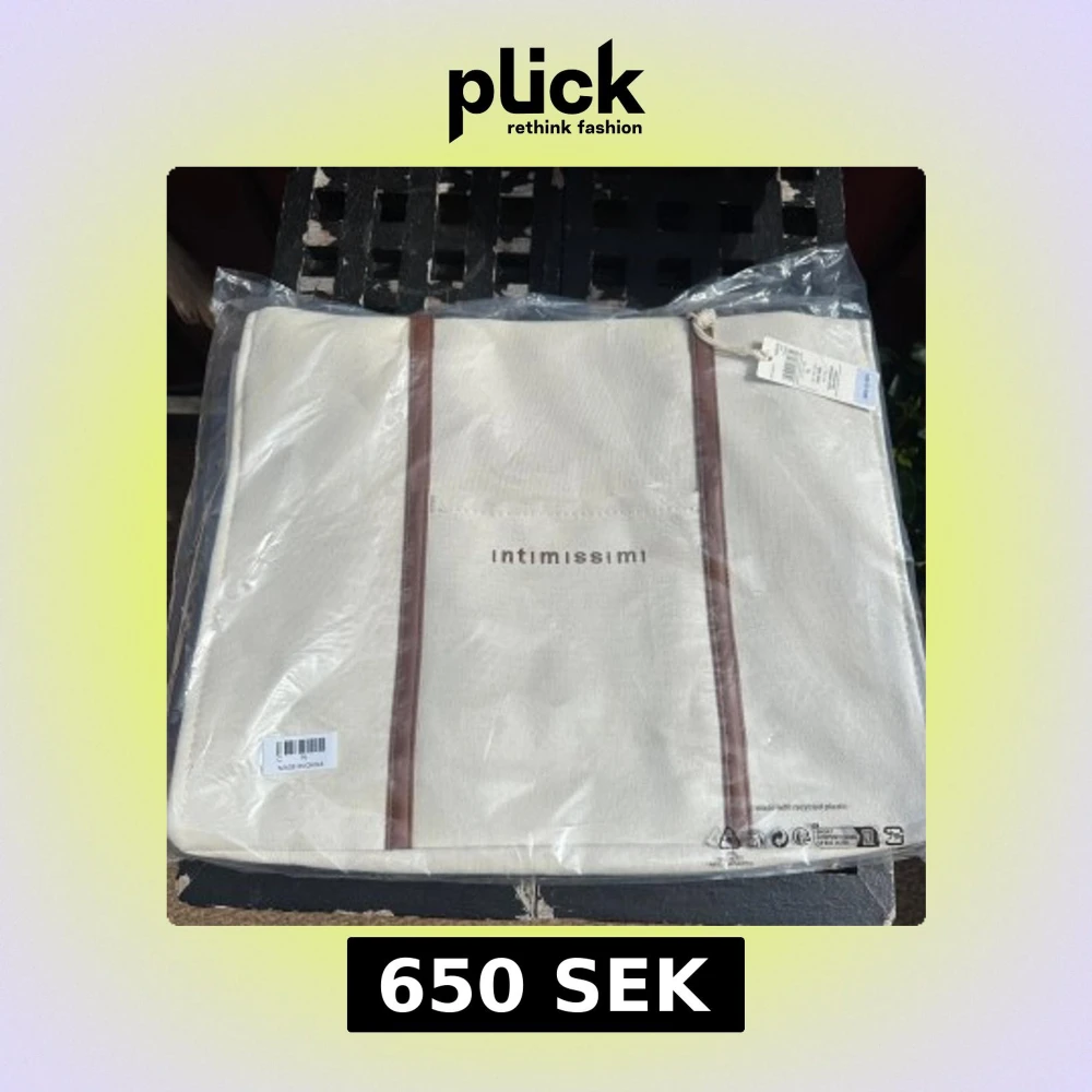 Stilren beige vĂ€ska frĂ„n Intimissimi med bruna detaljer lĂ€ngs sidorna. VĂ€skan Ă€r tillverkad i bomull och har ett minimalistiskt tryck med varumĂ€rket pĂ„ framsidan. Perfekt storlek för att bĂ€ra med sig allt man behöver under dagen, till stranden eller landetđ