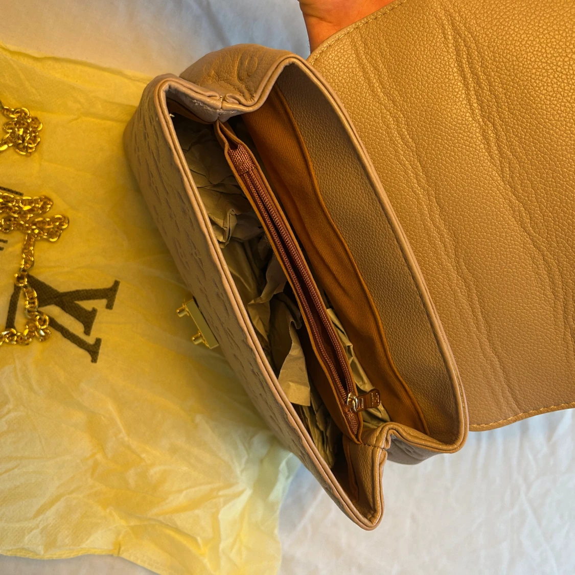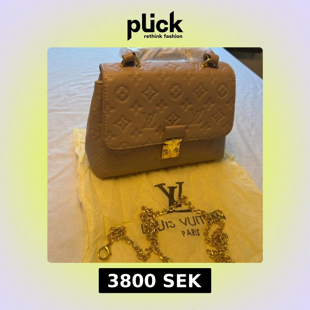 Superfin beige Louis Vuitton väska i präglat skinn med klassiskt LV-monogram. Väskan har guldfärgade metalldetaljer, lås framtill och en snygg kedjerem. Insidan har flera fack och dragkedja för extra förvaring. Perfekt för dig som vill ha något lyxigt och stilrent.