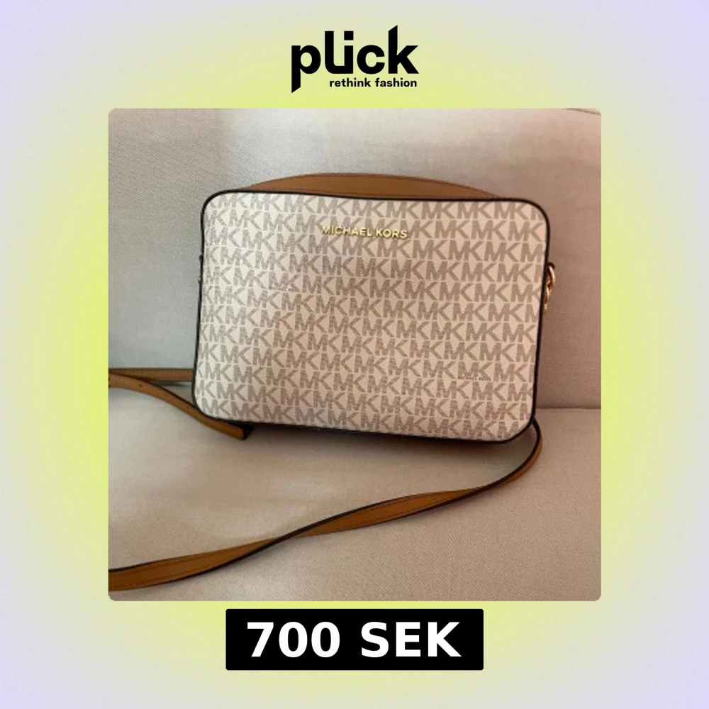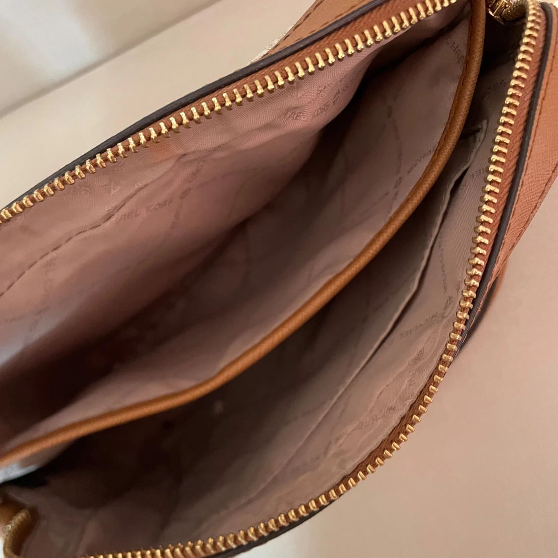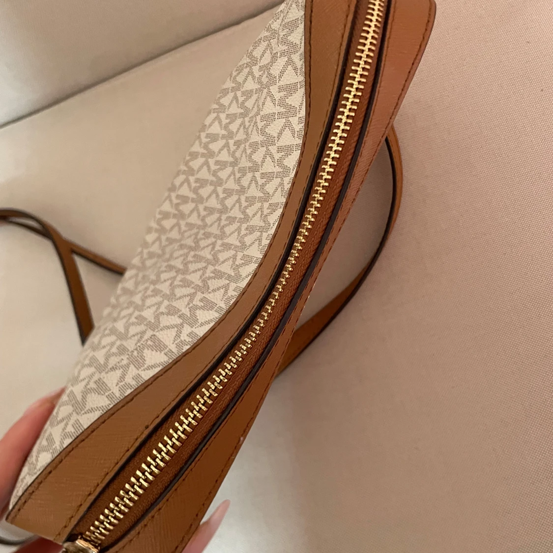 Snygg axelväska från Michael Kors i beige och brunt med MK-logga över hela väskan. Väskan har guldfärgad dragkedja, justerbar rem och flera fack inuti. Tillverkad i syntetmaterial med detaljer i skinn.