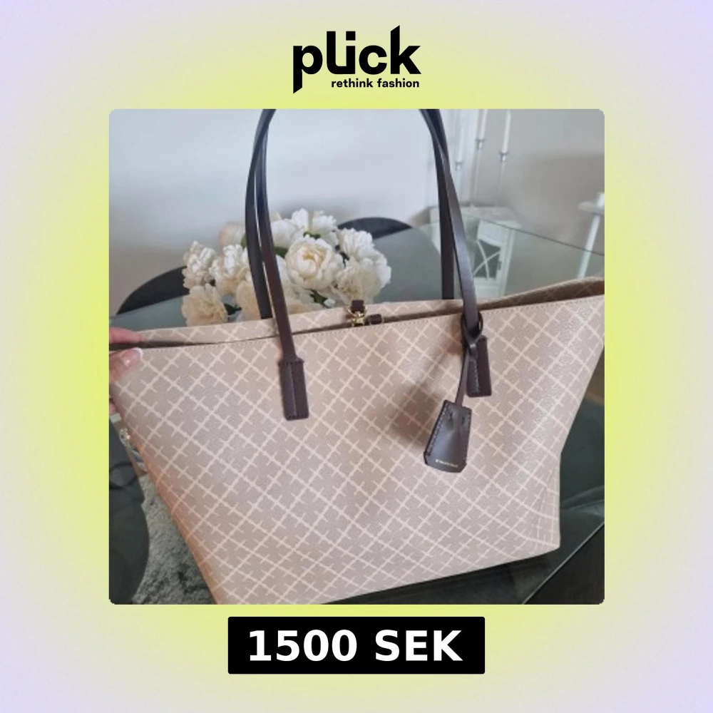 Säljer en snygg beige handväska från By Malene Birger med klassiskt grafiskt mönster och mörkbruna handtag. Väskan har dragkedja och gulddetaljer samt en innerficka med logotyp. Perfekt för dig som vill ha en stilren accessoar.