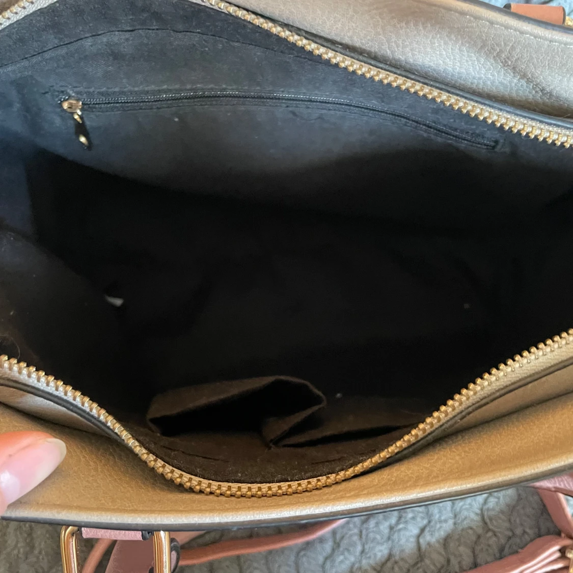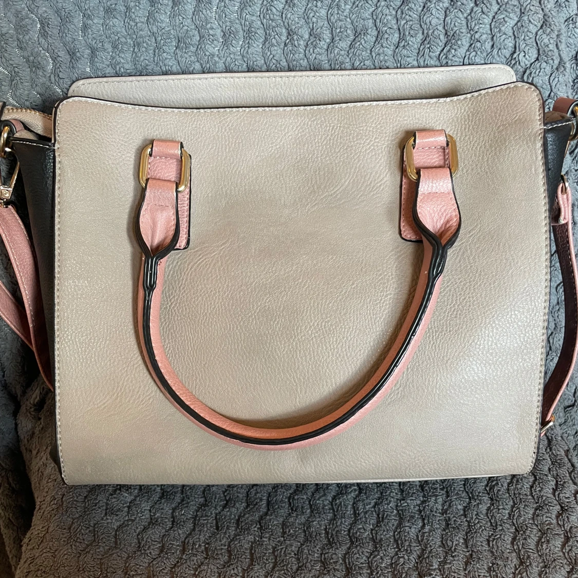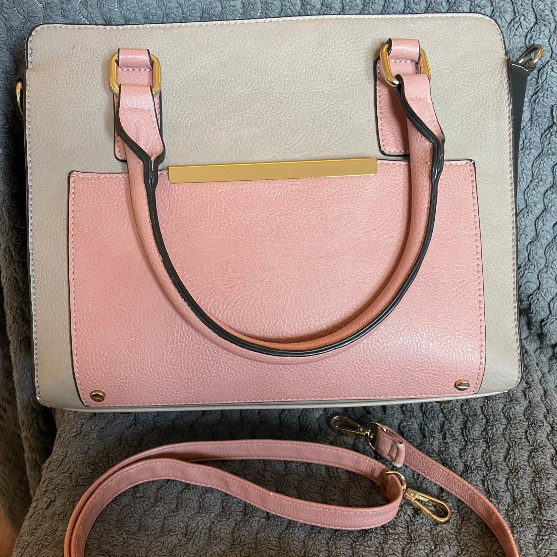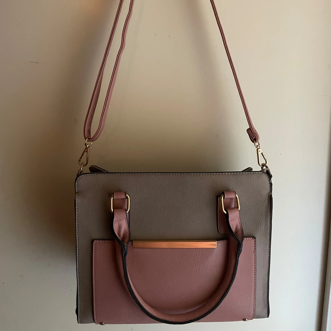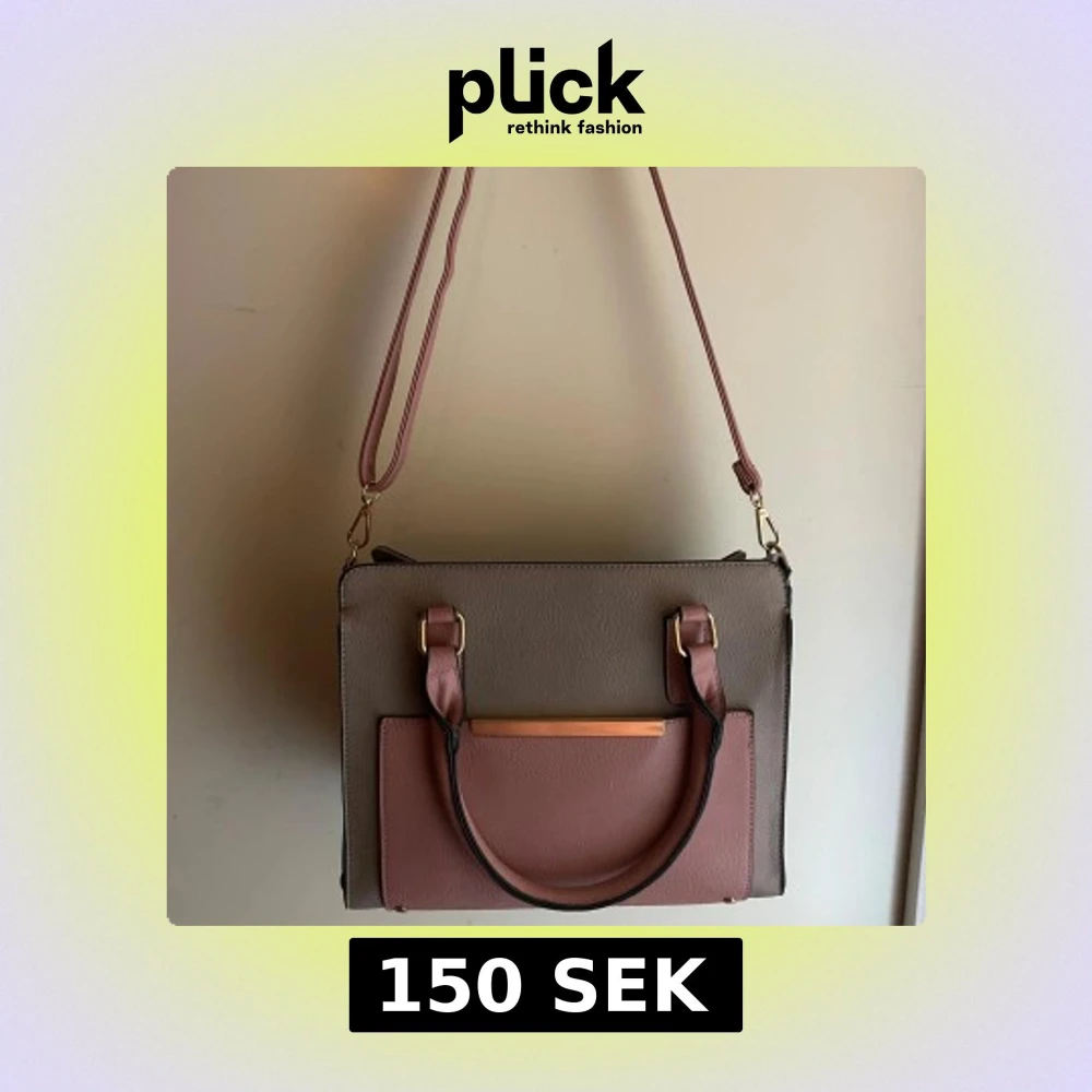 Snygg axelväska i beige och rosa med guldfärgade metalldetaljer. Väskan har både handtag och avtagbar axelrem, samt en praktisk ytterficka framtill. Tillverkad i syntetmaterial med dragkedja upptill och flera fack inuti för smart förvaring. Priset går även att diskuteras!