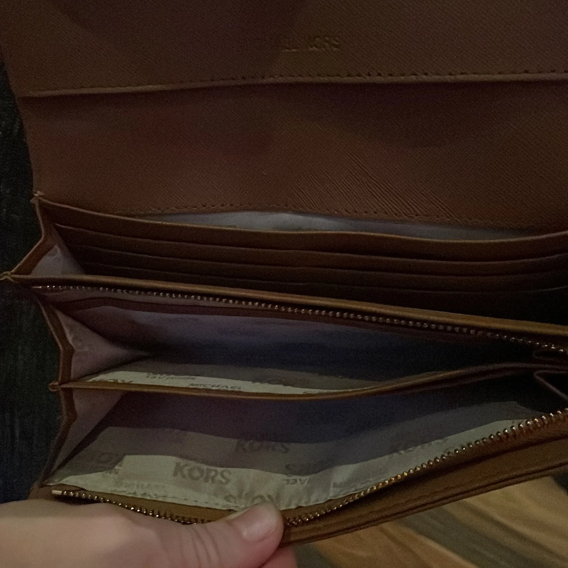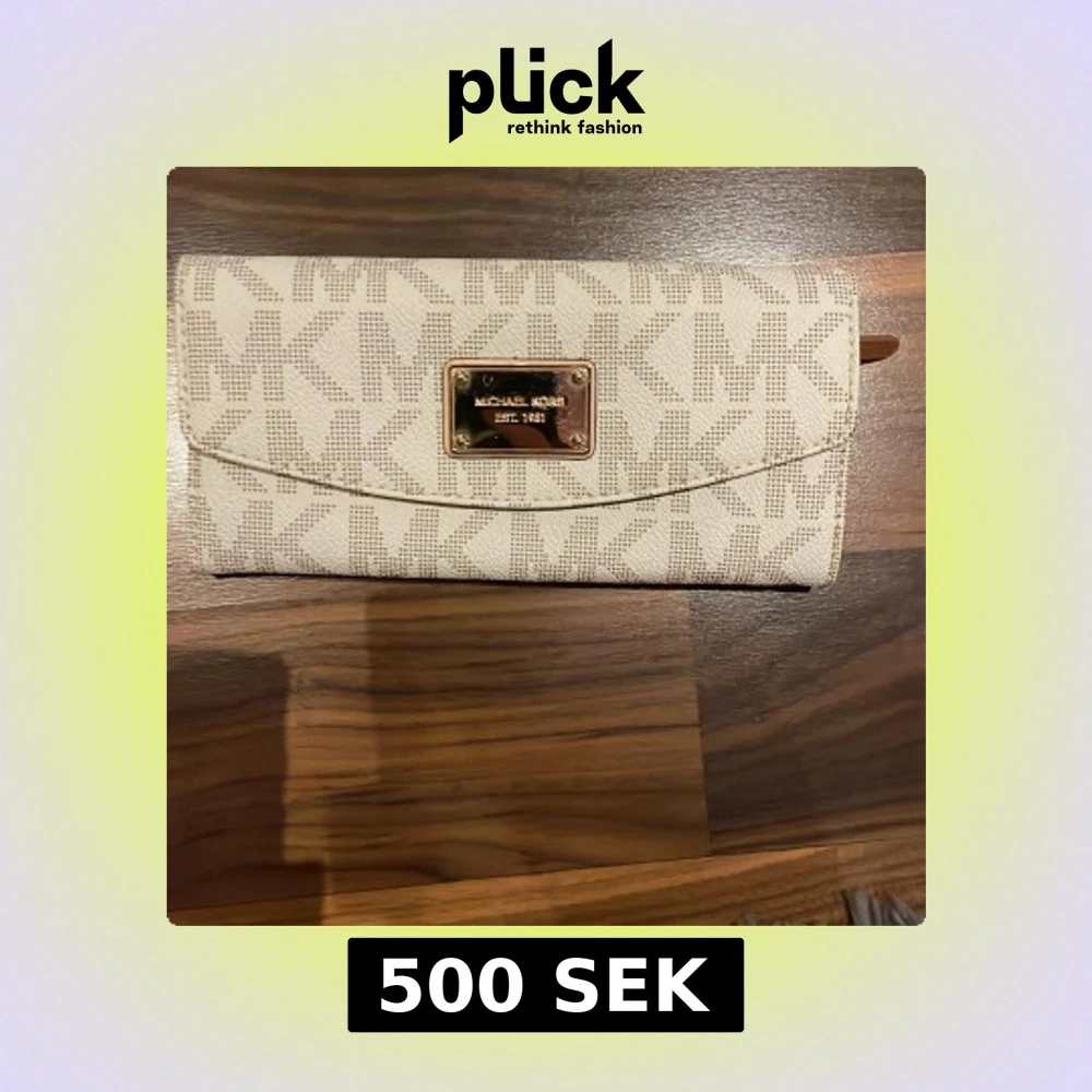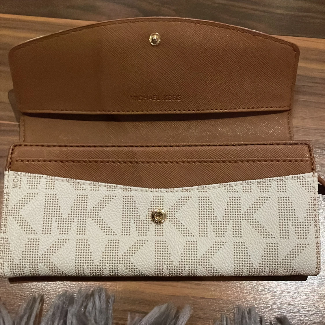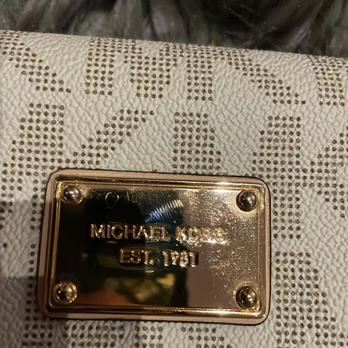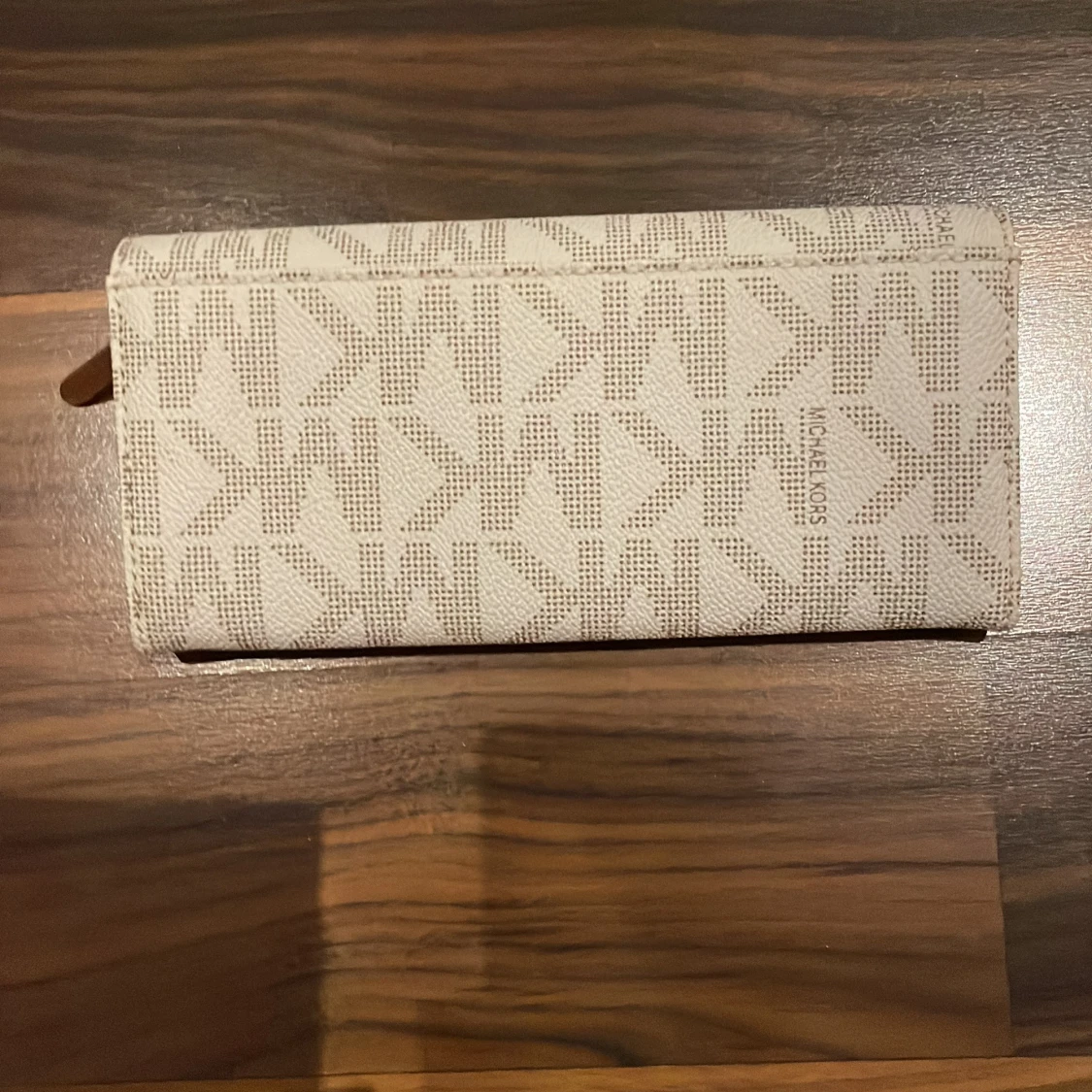Snygg beige plånbok från Michael Kors med MK-logga i mönstret och guldfärgad metallbricka framtill. Plånboken har flera fack för kort och sedlar, samt dragkedjefack inuti. Utsidan är i tåligt syntetmaterial och insidan är ljusbrun.