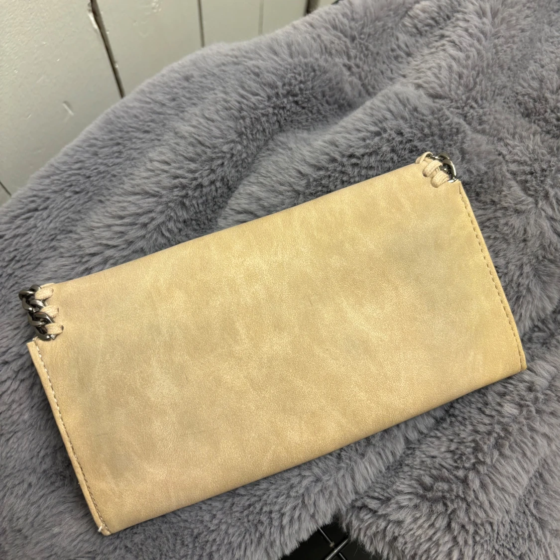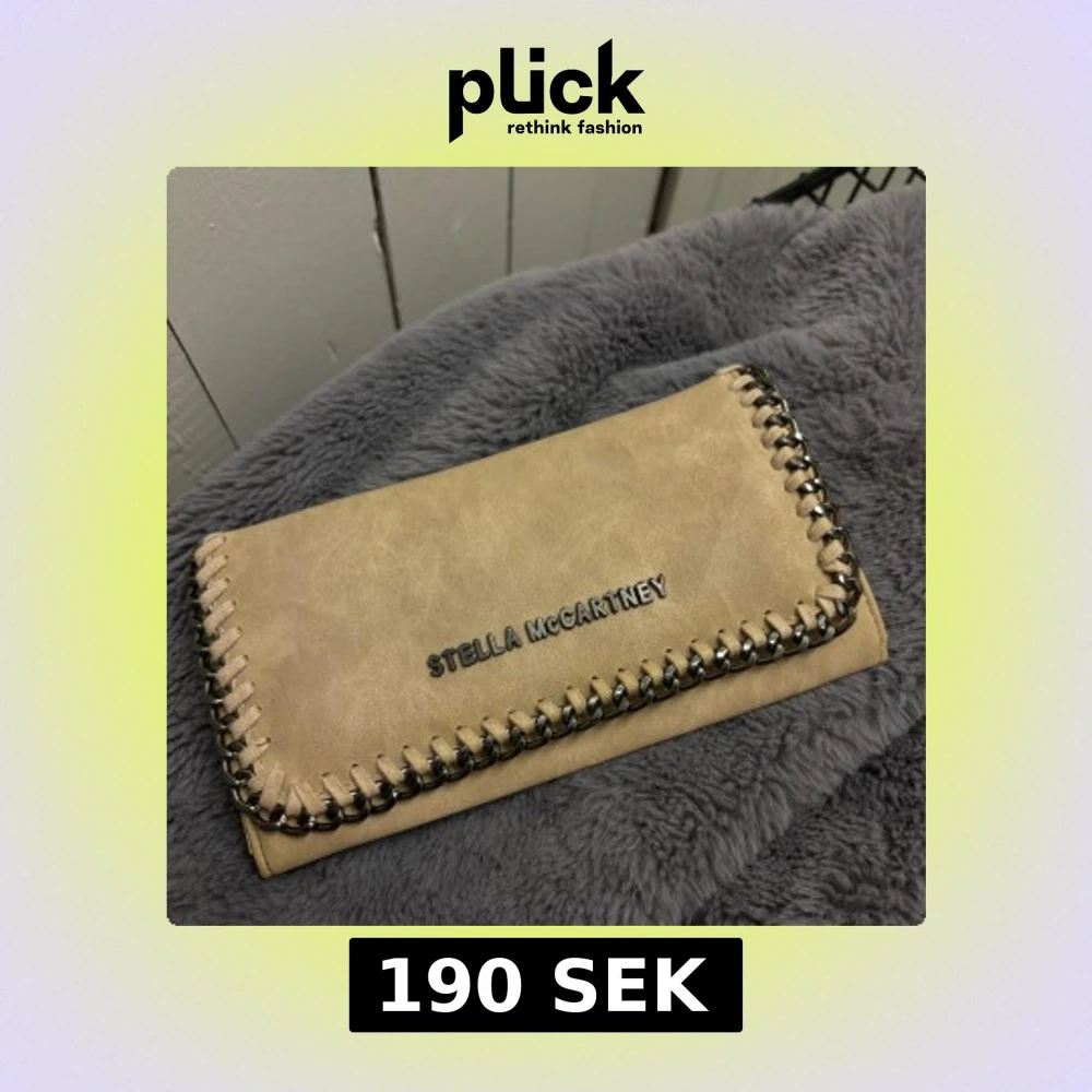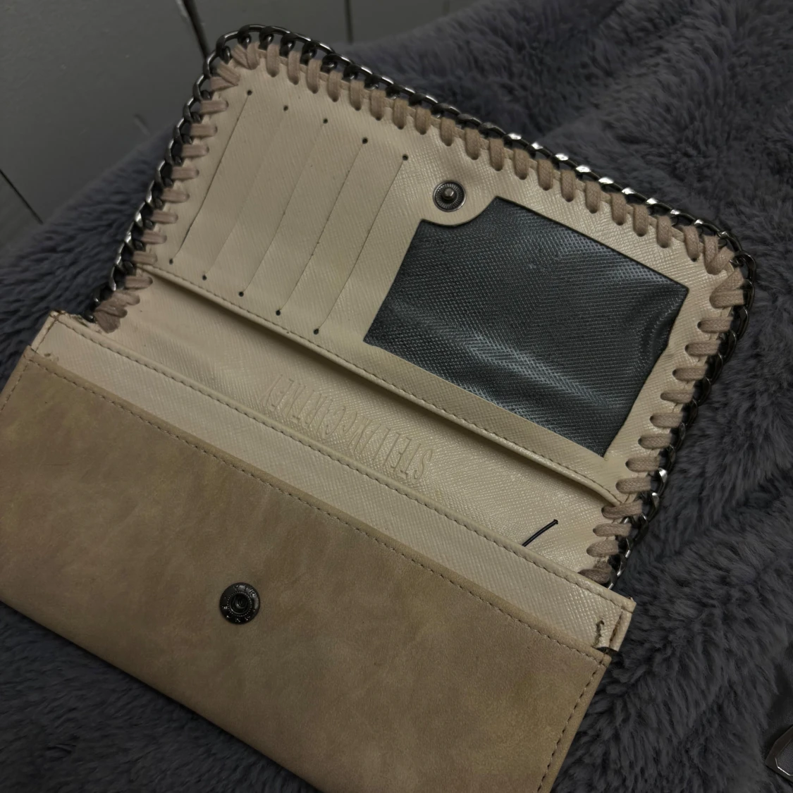 Snygg beige plånbok (KP) Stella McCartney med coola kedjedetaljer runt kanterna. Plånboken har flera kortfack, fönster för ID och tryckknappsstängning. Perfekt för dig som vill ha en stilren och trendig accessoar i väskan.