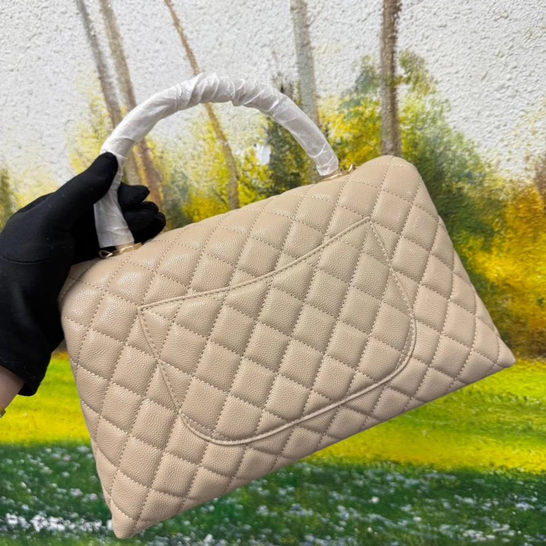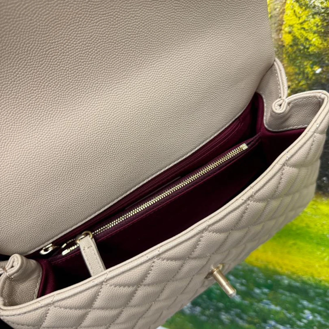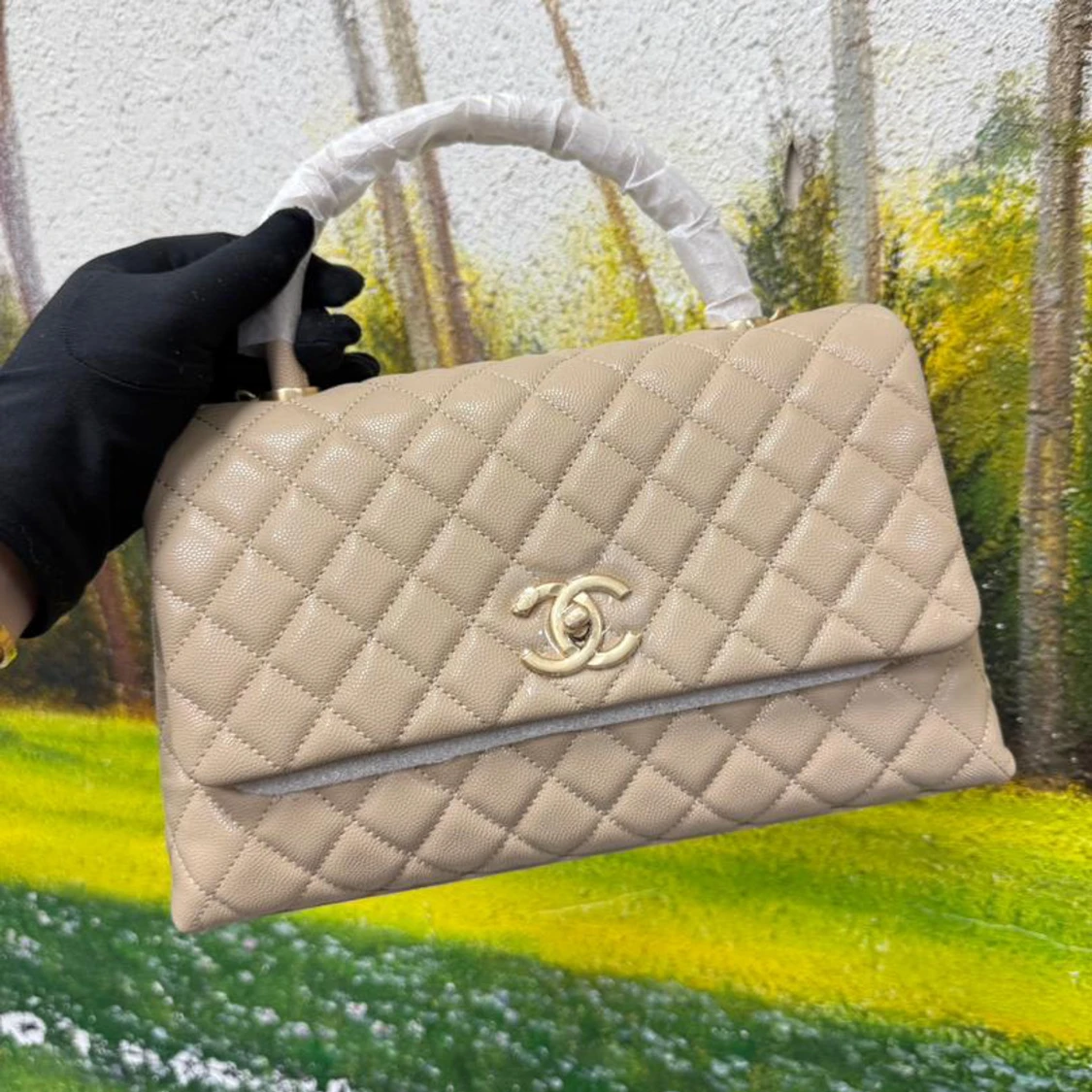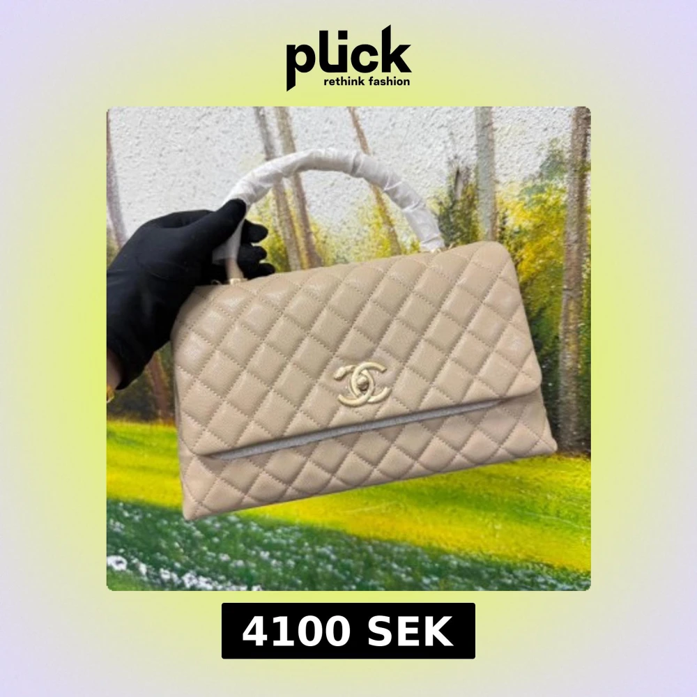 Säljer en beige quiltad handväska från Chane med klassiskt CC-spänne i guld. Väskan är i skinn och har ett elegant handtag, innerfoder i vinrött och praktisk dragkedja. Perfekt för dig som vill ha en lyxig och tidlös accessoar.