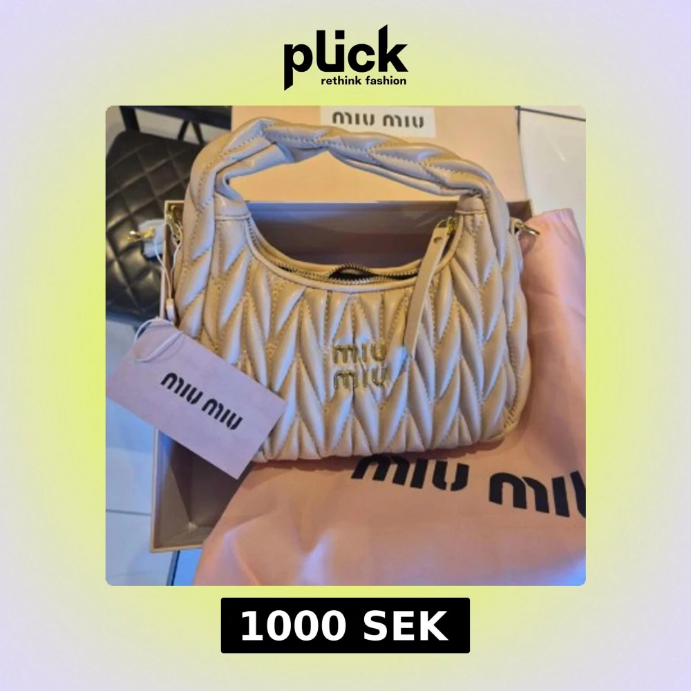 Snygg beige handväska från Miu Miu med quiltad design och guldfärgade detaljer. Väskan har ett mjukt, vadderat handtag och dragkedja upptill. Tillverkad i skinn och har Miu Miu-logga framtill. Perfekt storlek för det viktigaste och riktigt trendig look.