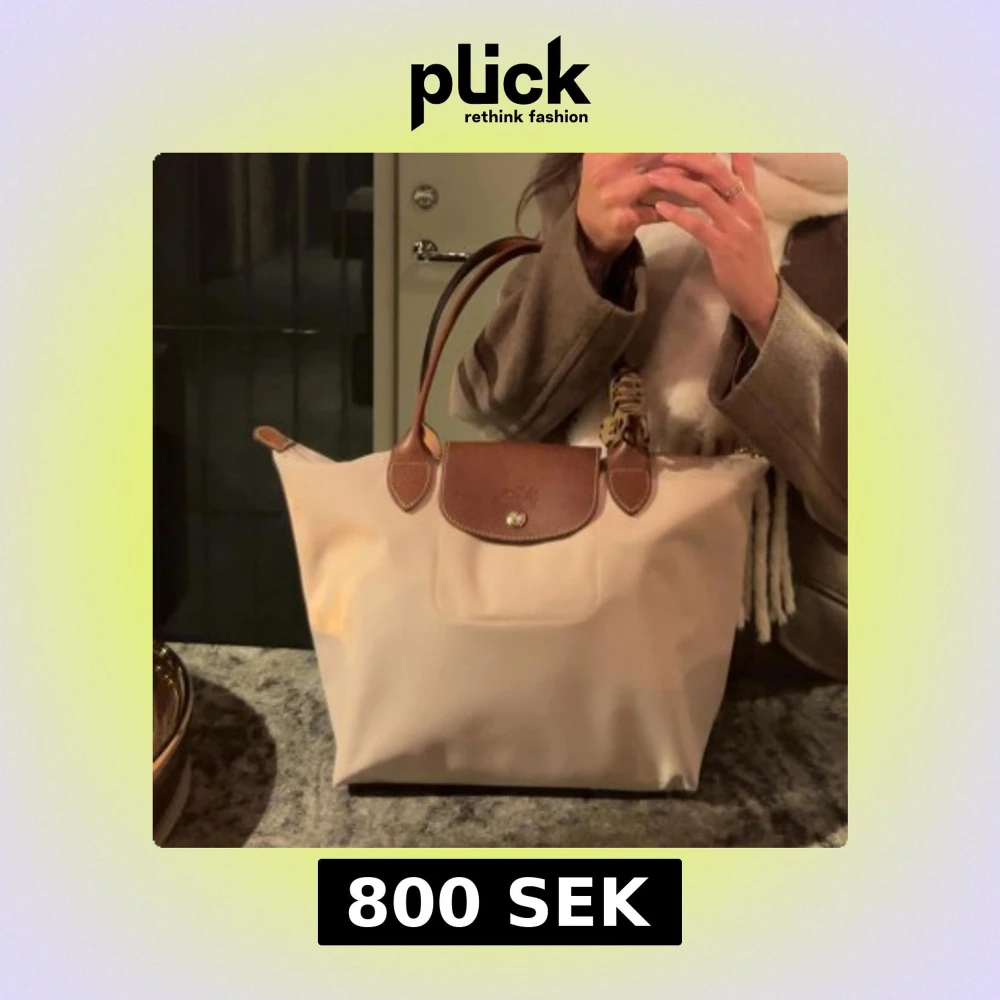 Säljer en klassisk beige shoppingväska från Longchamp med bruna skinnhandtag. Väskan har en enkel och stilren design med guldknapp framtill och rymligt huvudfack. Perfekt för dig som vill ha en snygg och praktisk väska till vardagen. Går även att vila ihop så den blir liten. Hör av dig om du har några frågor! 🫶🏼💕