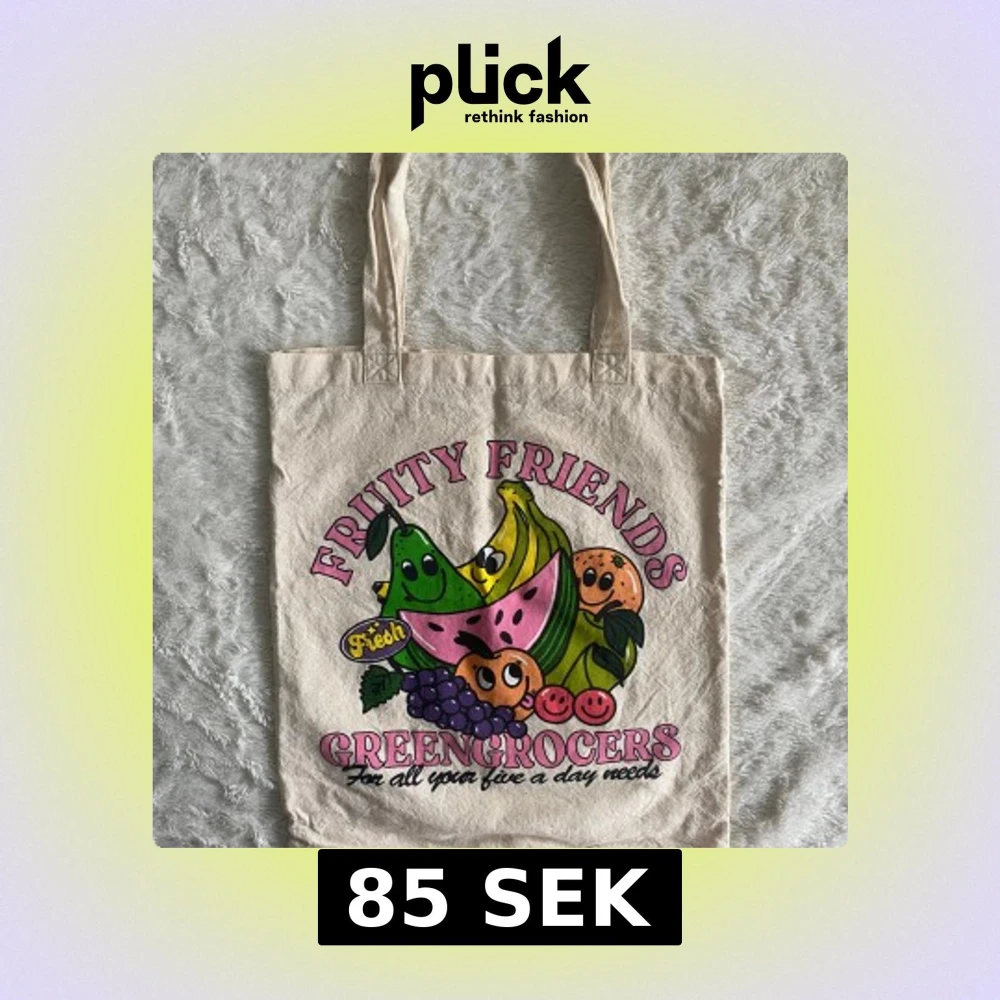 Säljer en beige shoppingväska med ett färgglatt fruktmotiv och texten 'Fruity Friends Greengrocers'. Perfekt för att bära dina dagliga inköp med stil. Väskan har långa handtag för enkel bärning.