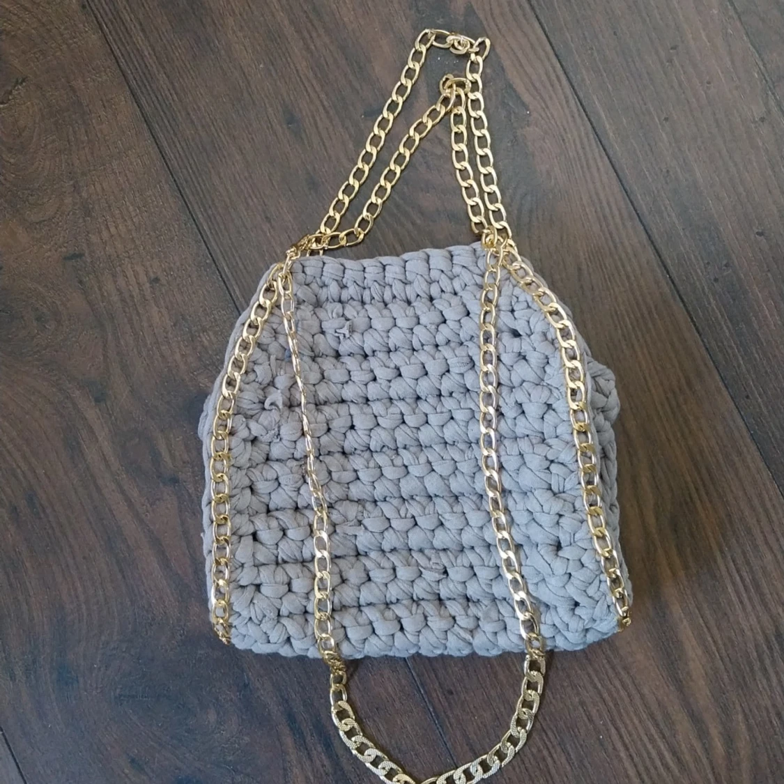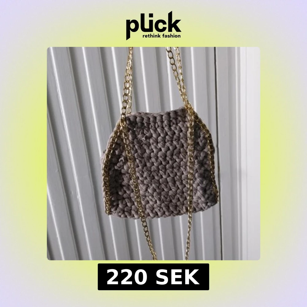 Säljer en beige virkad handväska med grovt virkat material och en snygg guldfärgad kedja. Perfekt accessoar för att lyfta din outfit med en unik touch.