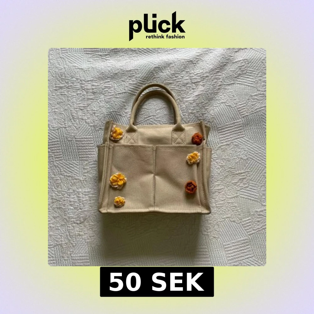 Superfin beige handväska från Zara x Smiley med broderade blommor i gult och oranget. Väskan är i kraftig bomullscanvas, har två handtag, flera fack och dragkedja upptill. Perfekt för dig som vill ha en söt och unik accessoar till vardagen.