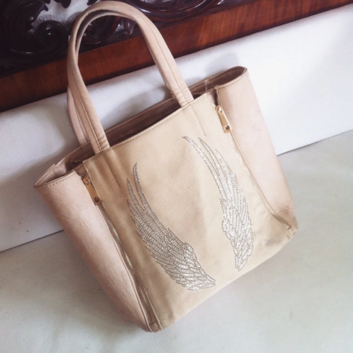 Beige väska, säljs billigt pga några märken på handtaget och på baksidan. Går bort en aning med tvätt. Frakt betalas av köpare.