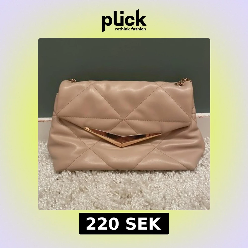 Snygg beige axelväska i quiltad design med guldfärgad kedja och coolt V-format spänne framtill. Väskan har ett stort fack och innerficka med dragkedja. Perfekt för dig som gillar stilrena detaljer och mjukt material.