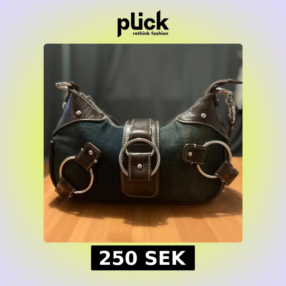Cool axelväska i mörkblått jeansmaterial med bruna skinnpartier och stora silvriga ringar som detaljer. Väskan har bred axelrem och kontrastsömmar, perfekt för dig som gillar en edgy och unik stil.