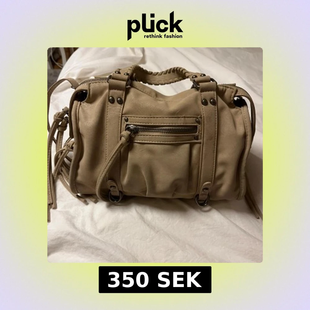 Snygg beige axelväska med flera dragkedjor och flätade handtag. Väskan har dekorativa knytband och metallnitar som ger en cool look. Perfekt för att bära dina dagliga nödvändigheter med stil.
