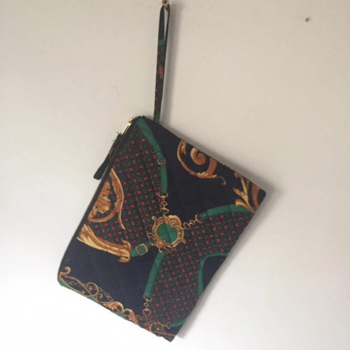 Kuvertväska från Beyond retro, quiltat vadderat tyg med mörkgrönt innerfoder. Passar tperfekt som fodral till iPad eller liten laptop, eller som liten handväska.