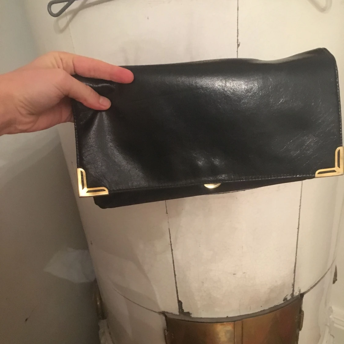 Mörkblå/svart kuvertväska i skinnimitation m guldiga detaljer. Två stora fack + ett mindre m dragkedja